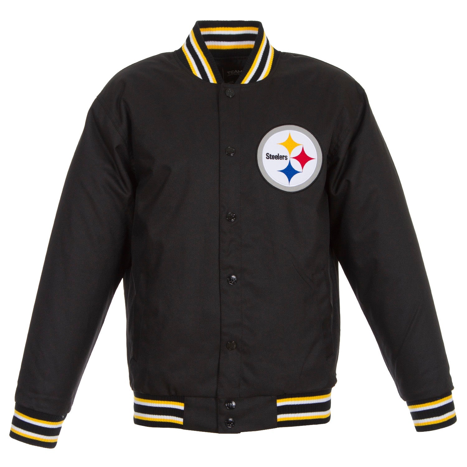 Pittsburgh Steelers poly-twill jacket in black with quilted knit jersey lining and embroidered logos.