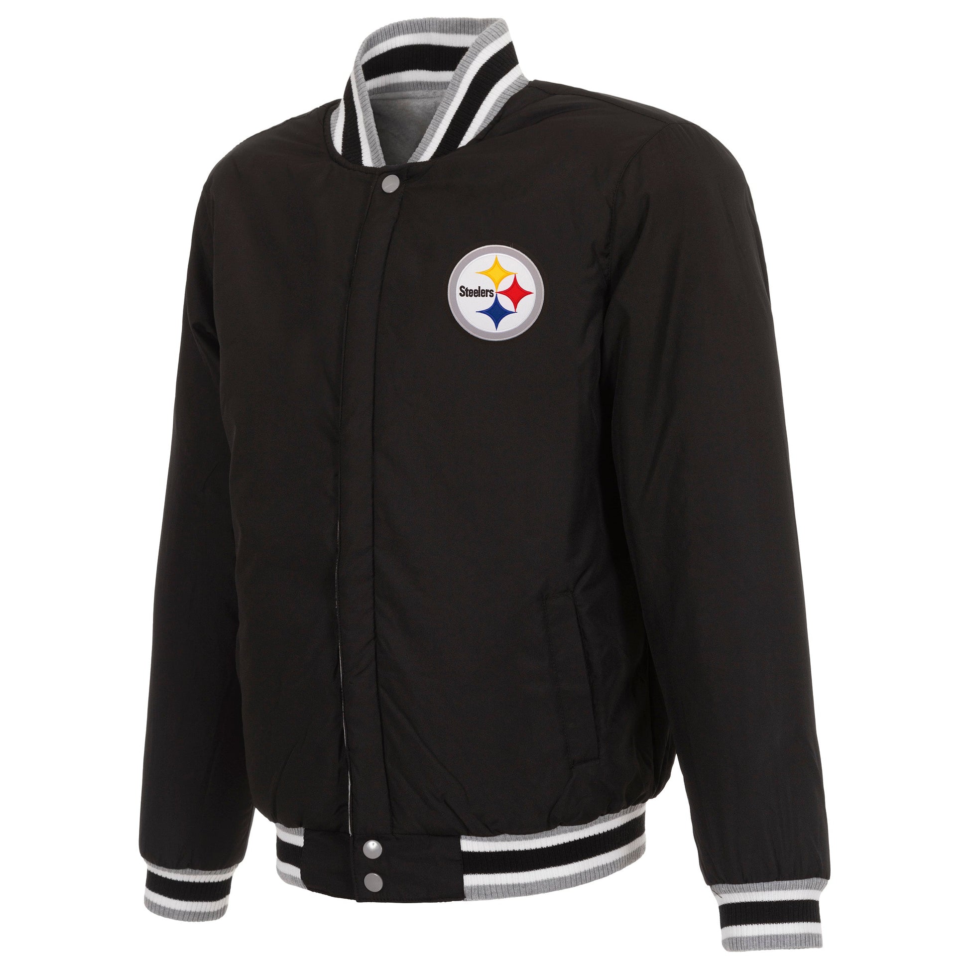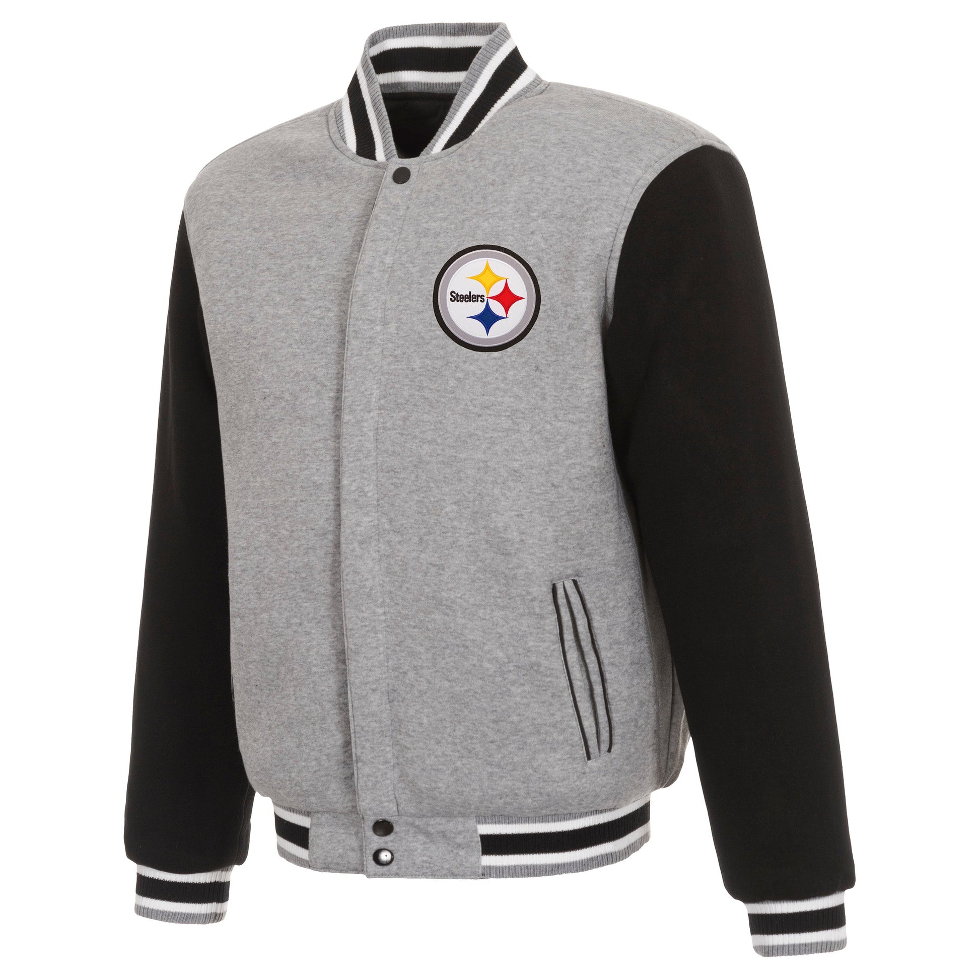 Pittsburgh Steelers reversible two-tone fleece jacket in grey and black with embroidered logos. Assembled in the USA. 100% polyester body, reverse nylon side, snap button closure.