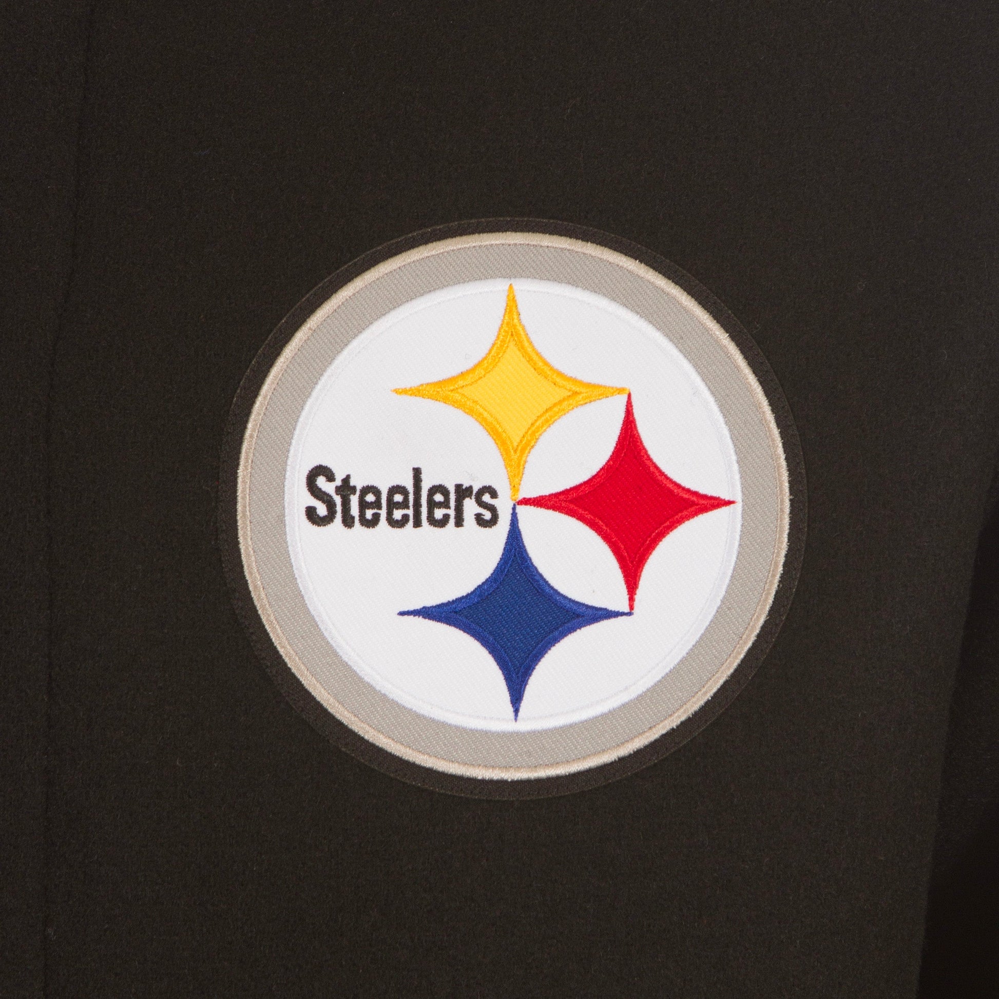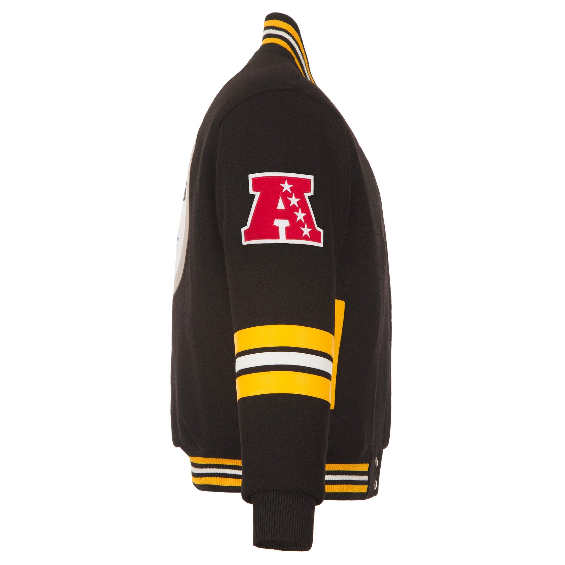 Pittsburgh Steelers wool varsity jacket with quilted nylon lining in black and yellow. Embroidered team logos with yellow and white leather sport stripes. 55% wool 45% polyester body, traditional snap front closure.