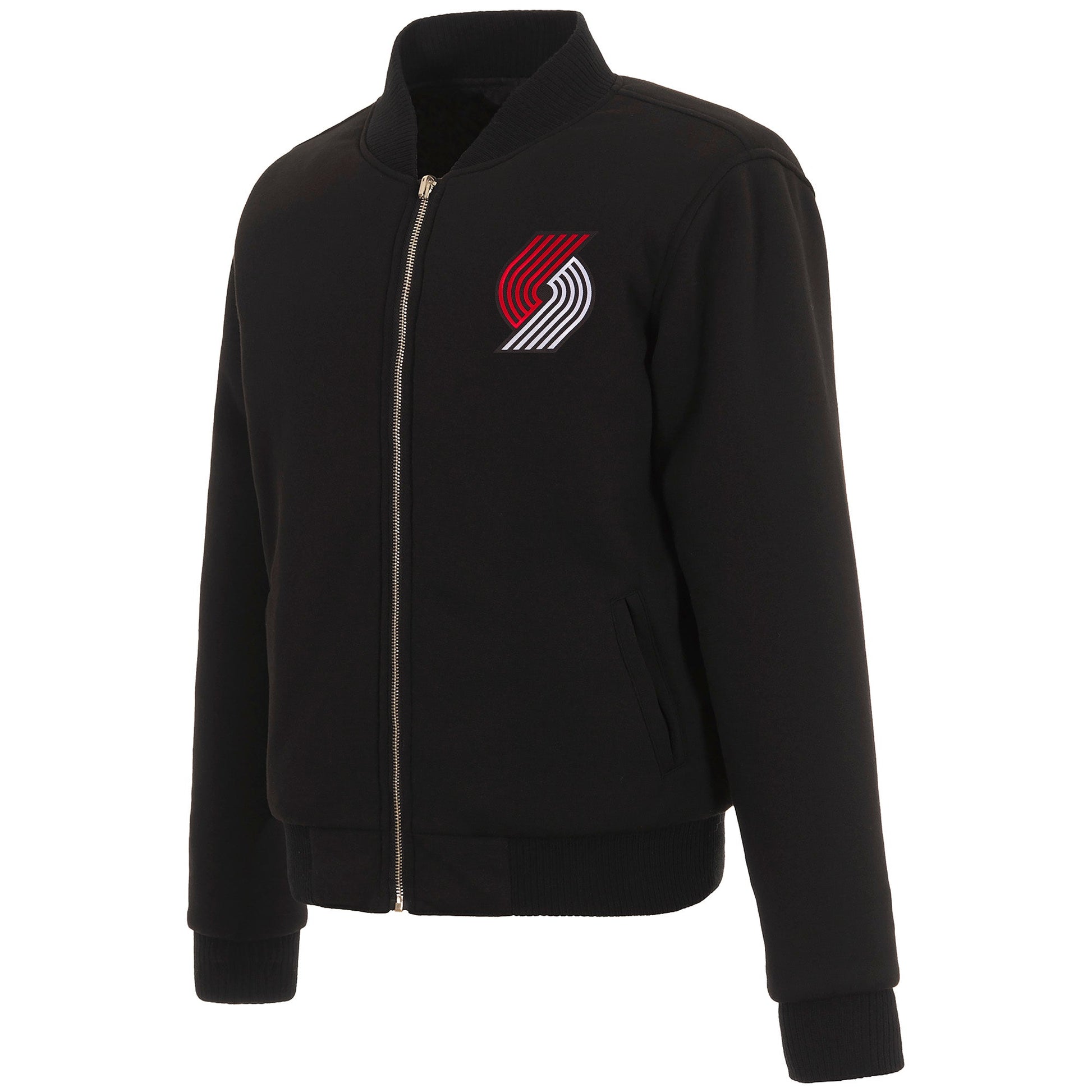 Portland Trail Blazers Ladies Reversible Fleece Jacket in black with embroidered logos. Assembled in the USA. 100% polyester body, reverse nylon, snap button closure.