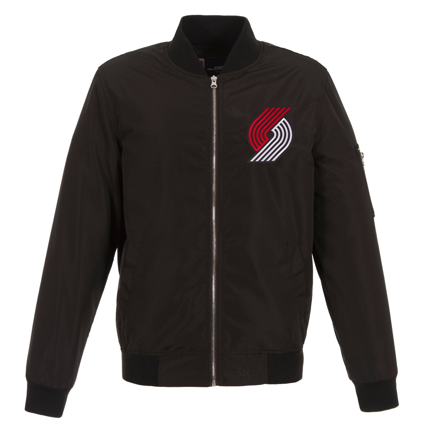 Portland Trail Blazers nylon bomber in black with embroidered logos.