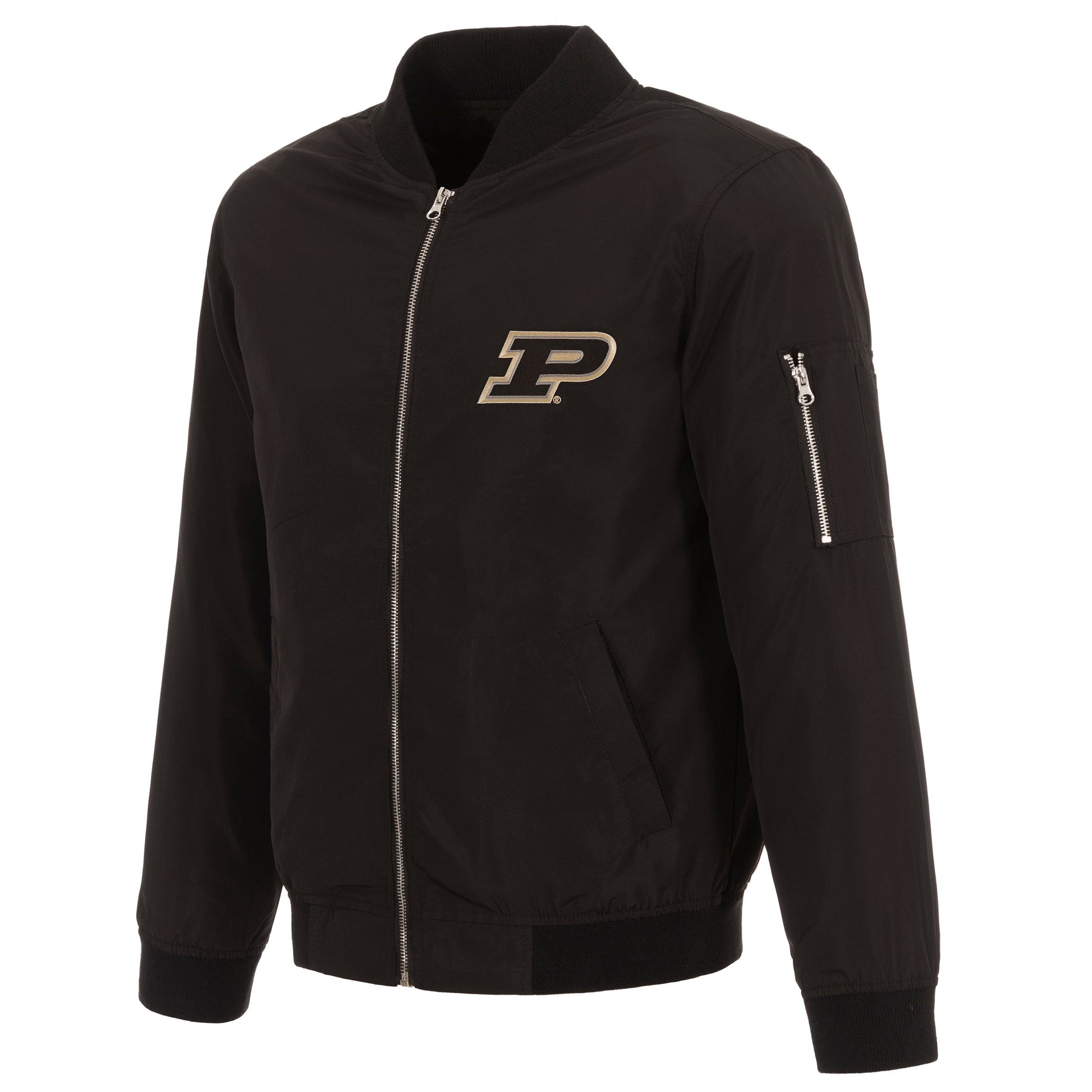Purdue University nylon bomber in black with embroidered logos. Assembled in the USA. 100% Nylon, full length zip front.