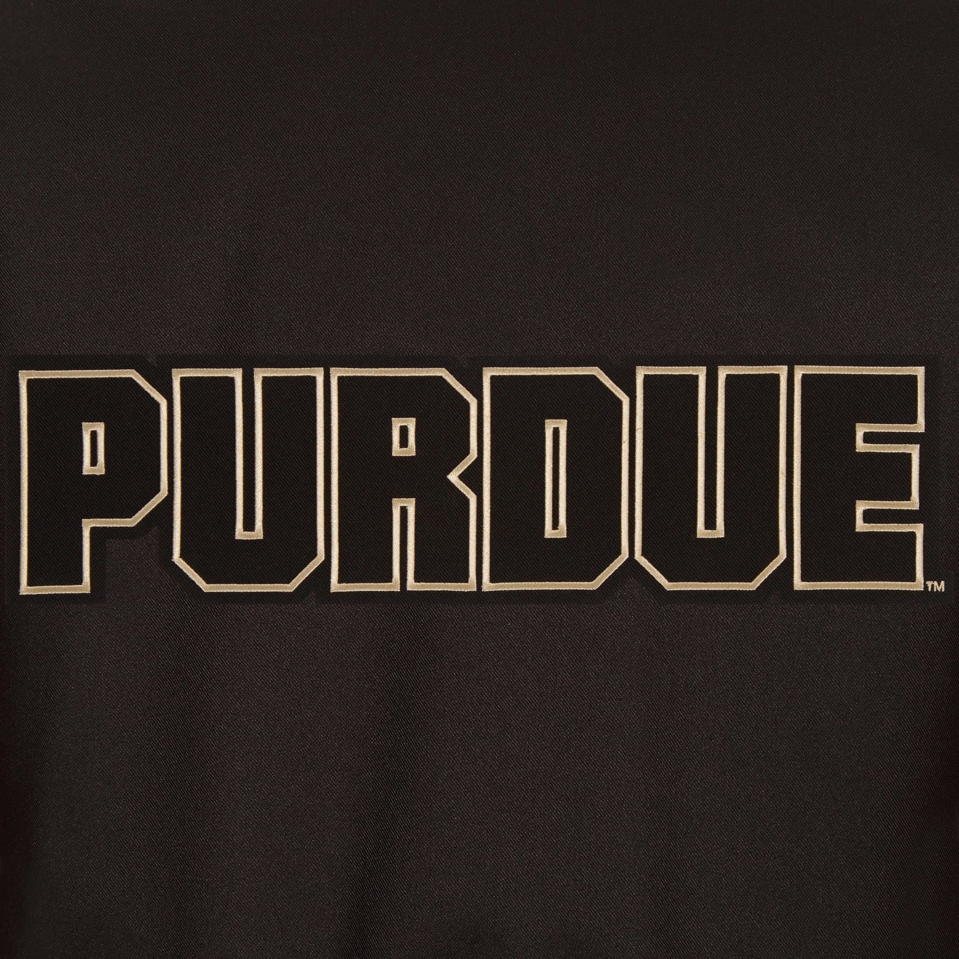 Purdue University Poly-Twill Jacket with quilted nylon lining in black with embroidered logos. Assembled in the USA. 100% polyester body. Snap button closure.