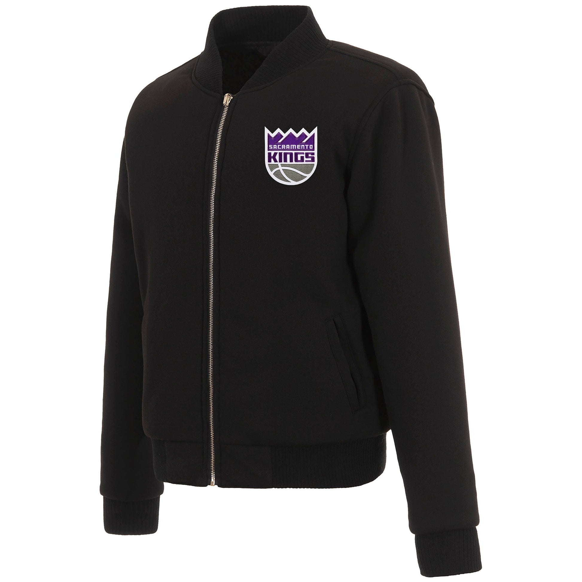 Sacramento Kings Ladies reversible fleece jacket in black with embroidered logos. Assembled in the USA. 100% polyester body, reverse nylon side, metal zip closure.