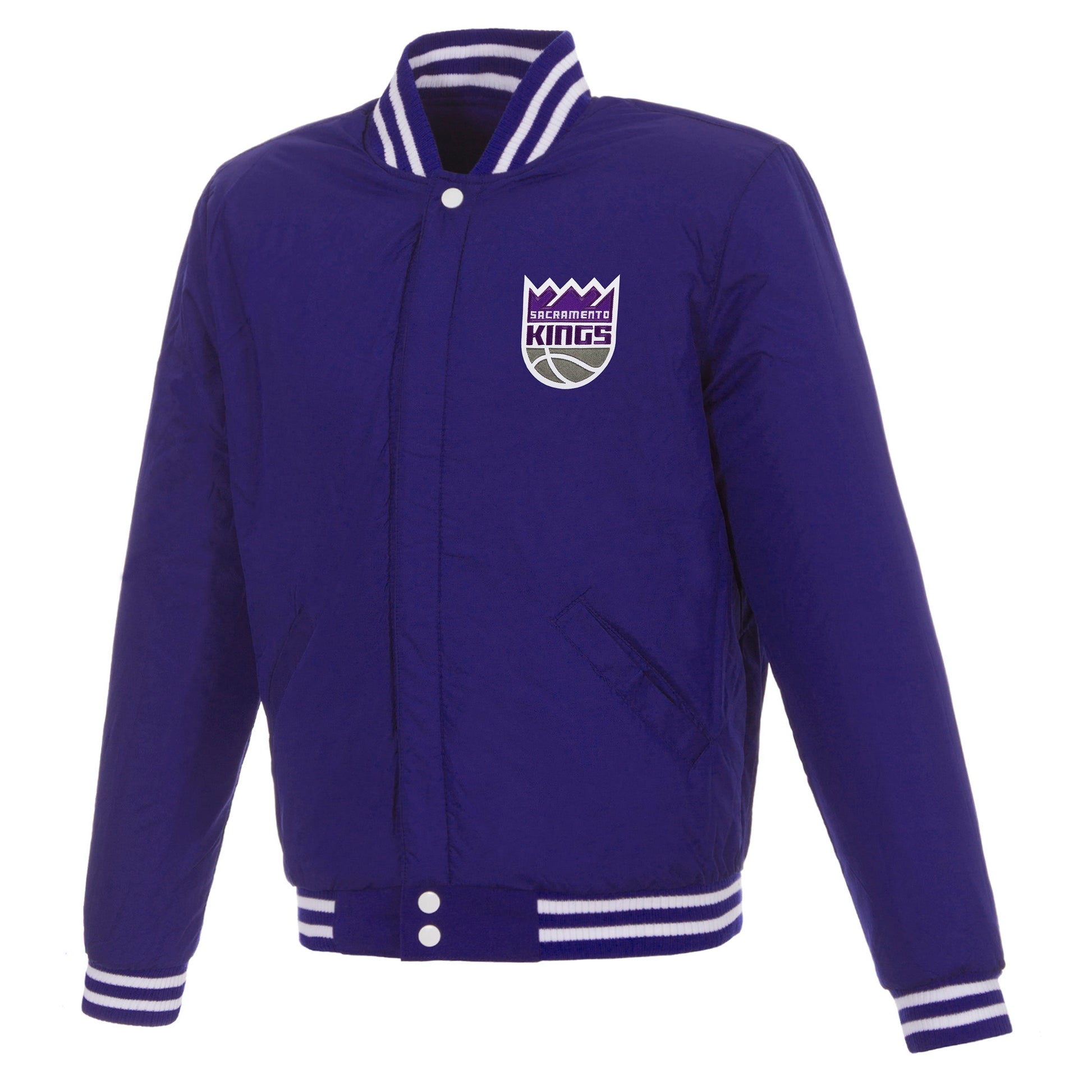 Sacramento Kings Reversible Varsity Jacket with faux leather sleeves in purple and white with embroidered logos. Assembled in the USA. 100% Polyester body, faux leather sleeves, snap button closure.