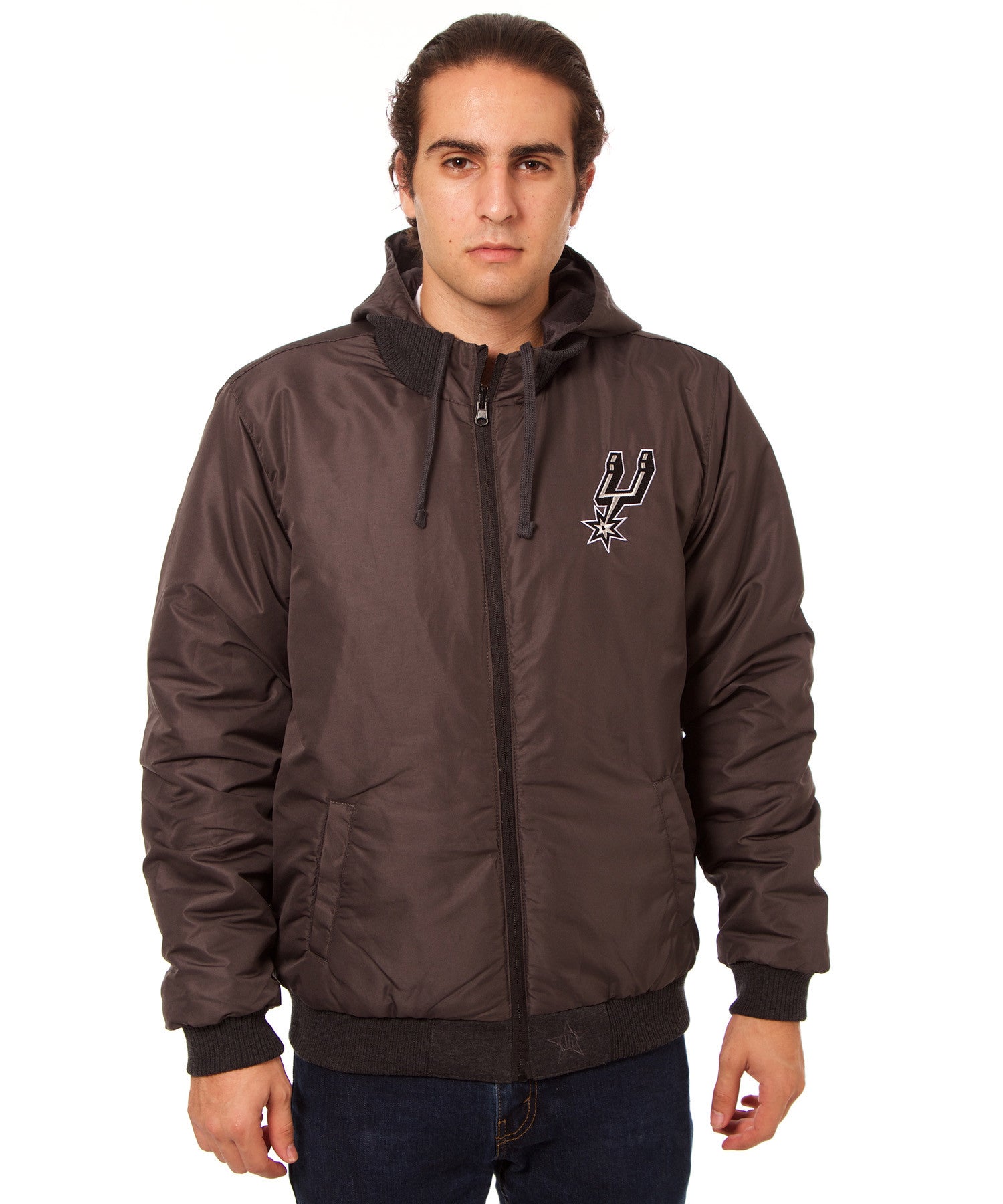 San Antonio Spurs reversible fleece hooded jacket with polyester color-blocking and embroidered appliqué logos. Reverse side is nylon.
