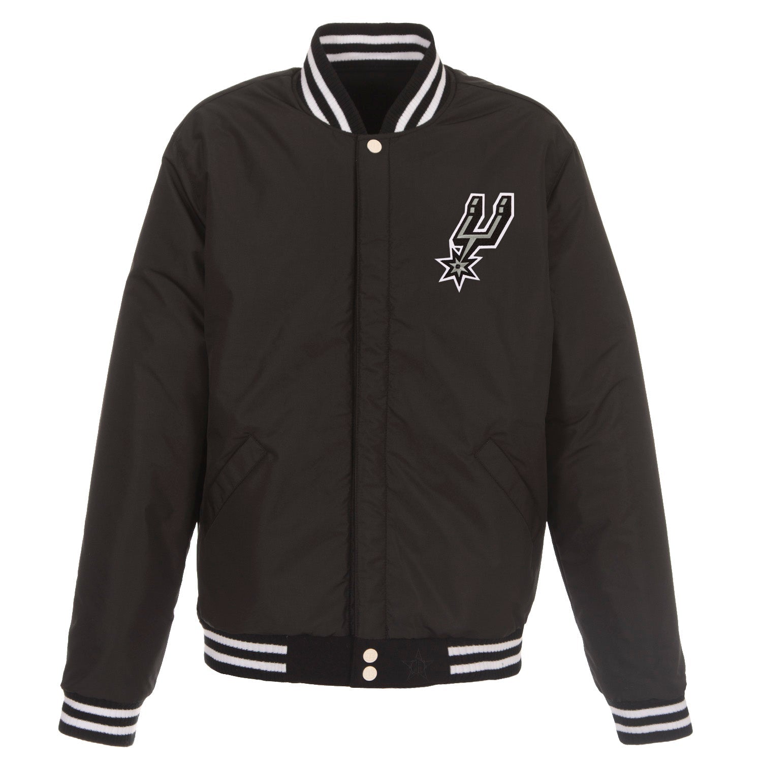 San Antonio Spurs reversible fleece jacket with Faux Leather sleeves in black-white with nylon lining and embroidered logos. (Front and Back Logos)
