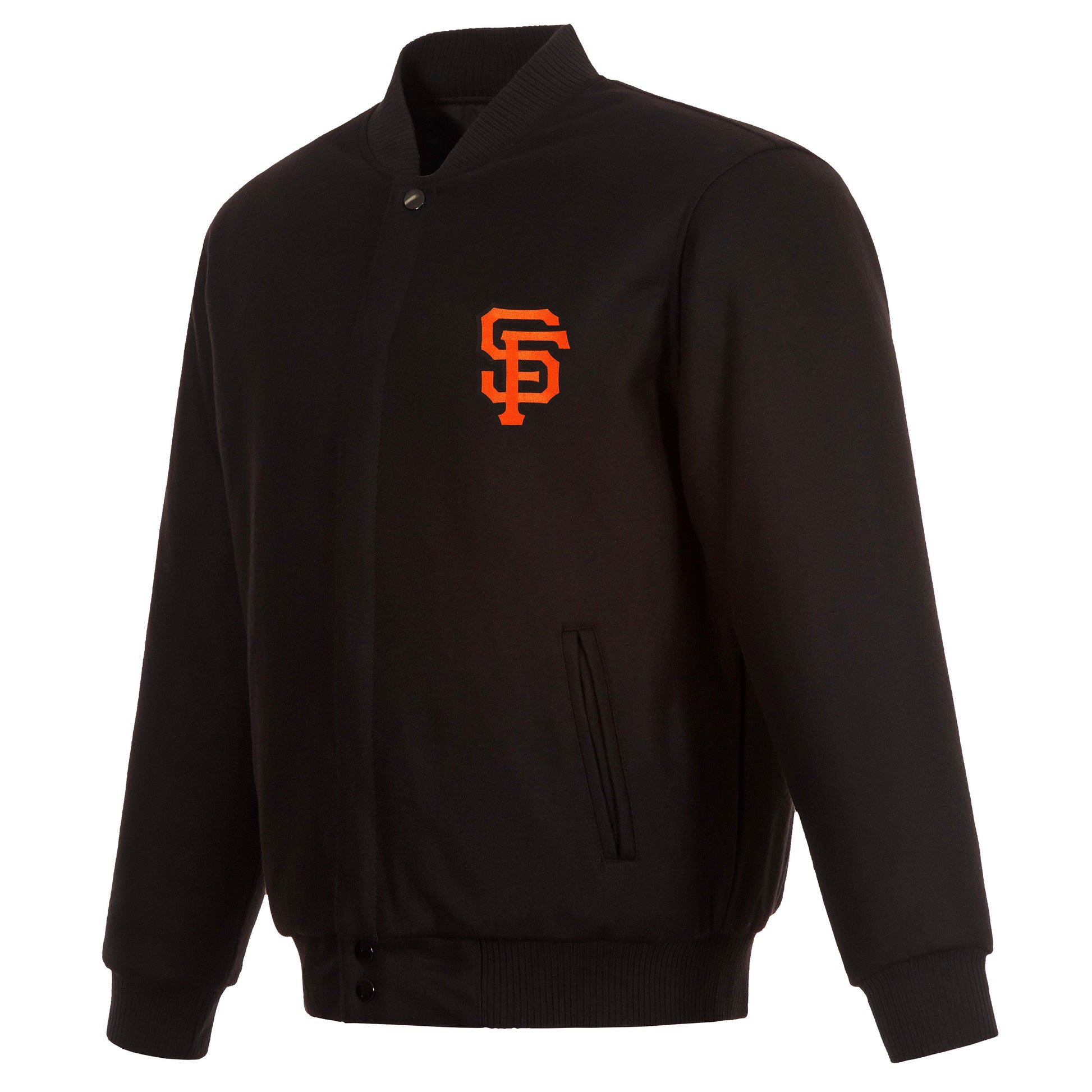 San Francisco Giants reversible all-wool jacket in black with nylon lining and embroidered appliqué patches. Reverse nylon side.