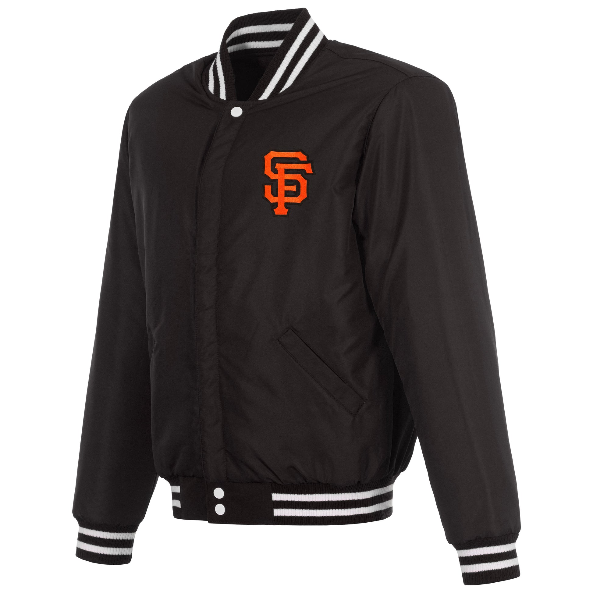 San Francisco Giants reversible fleece jacket with Faux Leather sleeves in black and white with nylon lining and embroidered logos.
