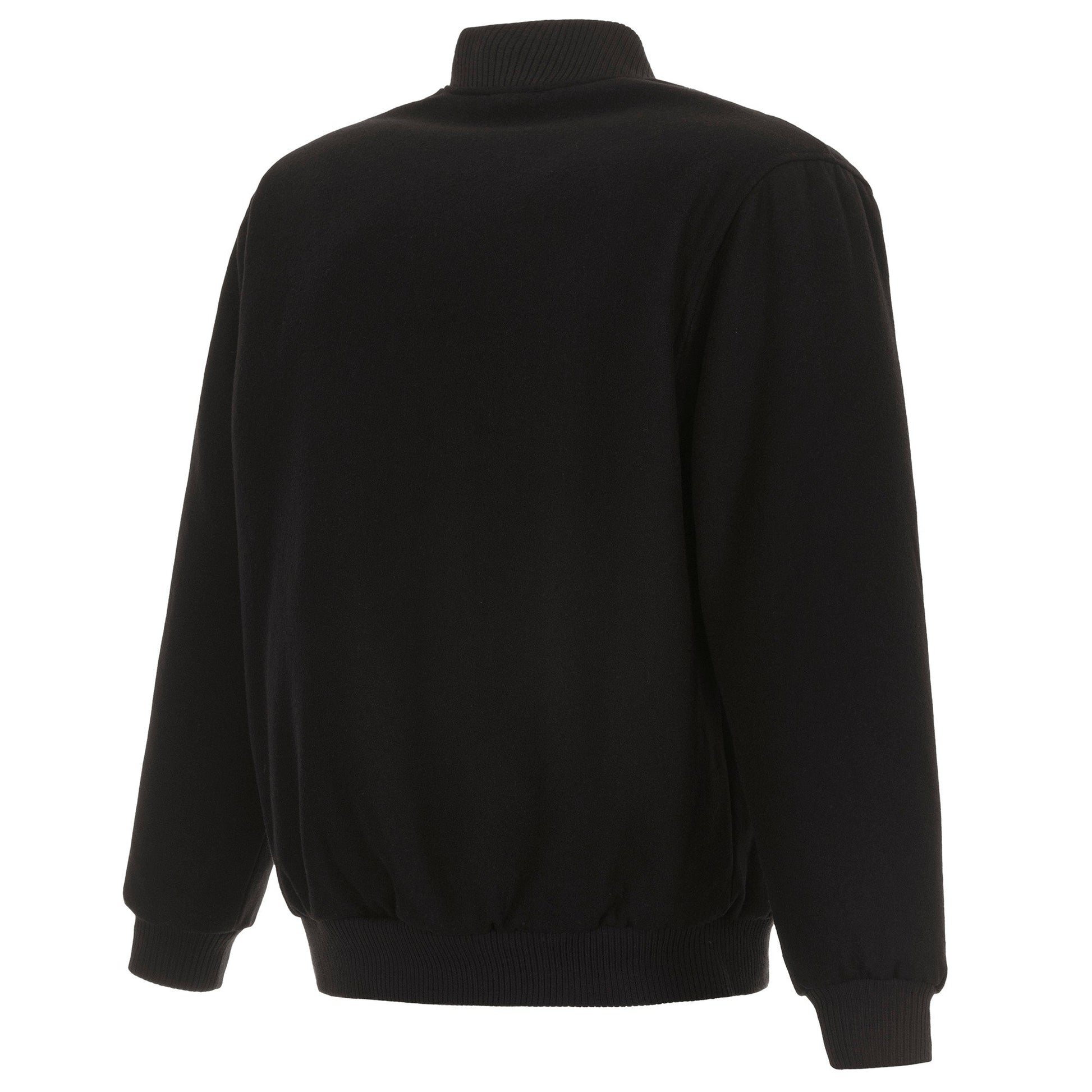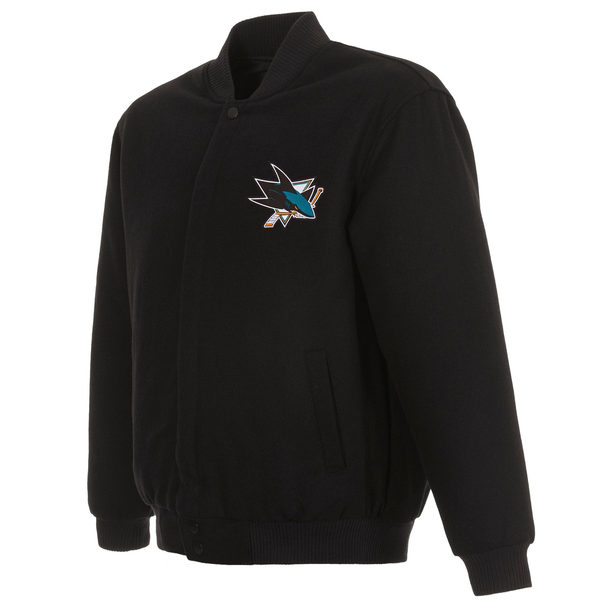 San Jose Sharks All Wool Jacket with nylon lining in black and yellow with embroidered logos. Assembled in the USA. 55% wool 45% polyester body. Snap button closure.
