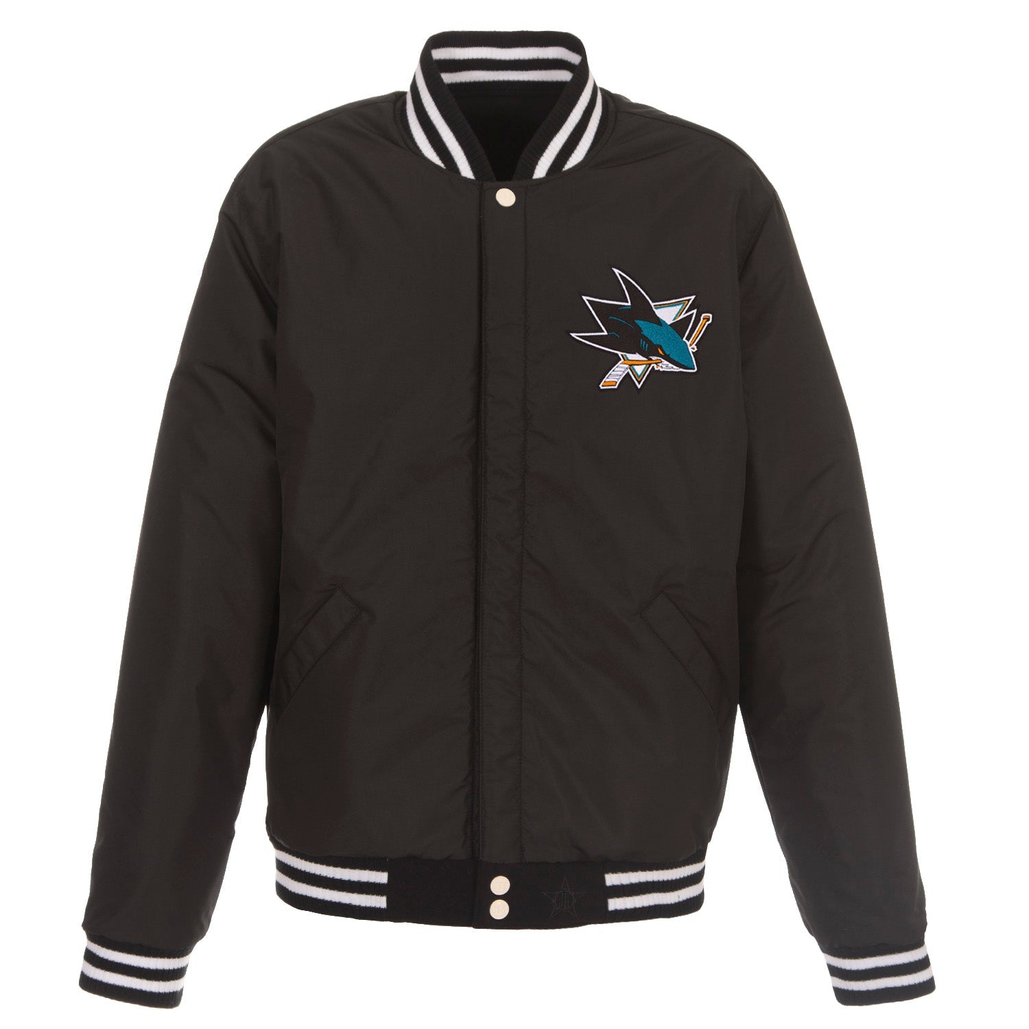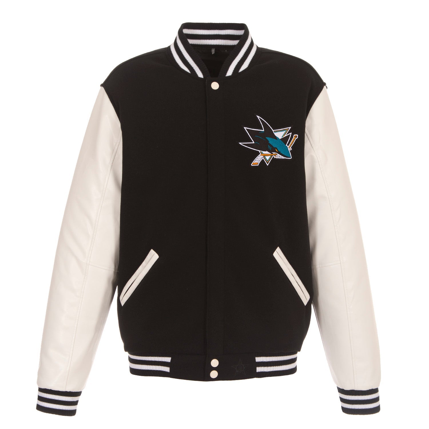 San Jose Sharks reversible fleece jacket with faux leather sleeves in royal and white with embroidered logos. Assembled in the USA. 100% Polyester body, faux leather sleeves, snap button closure.