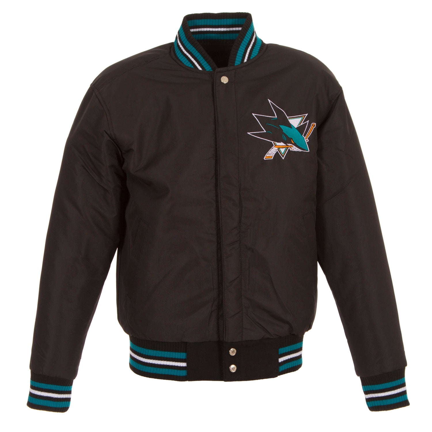 San Jose Sharks reversible wool jacket in black-teal with nylon lining, embroidered appliqué logos and knit trim.