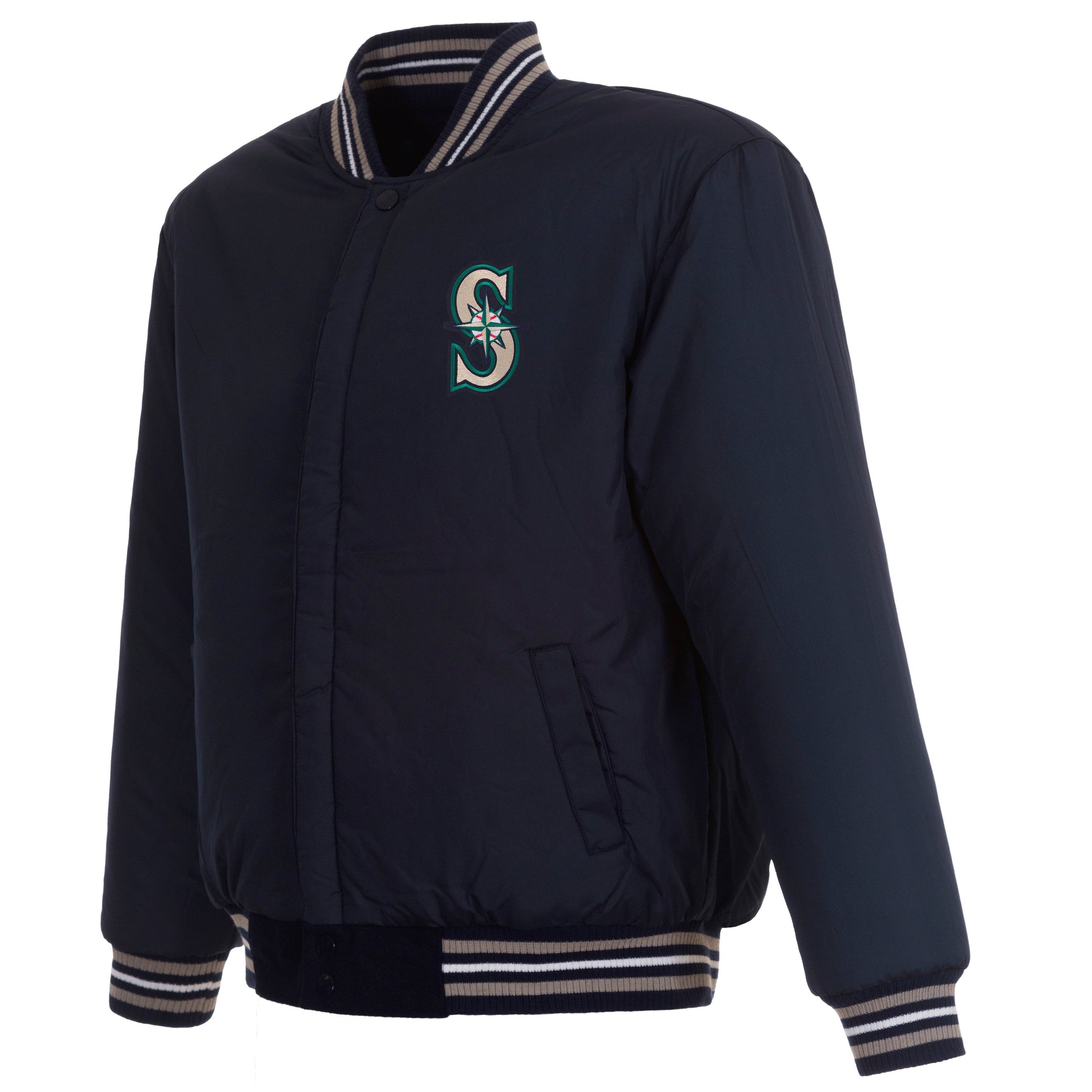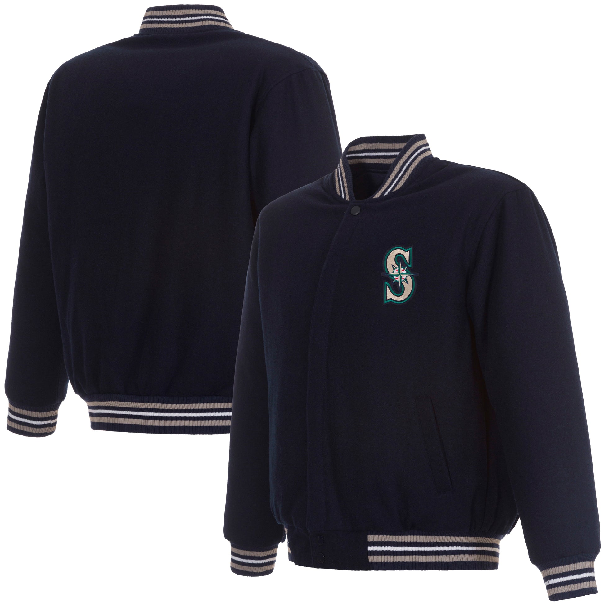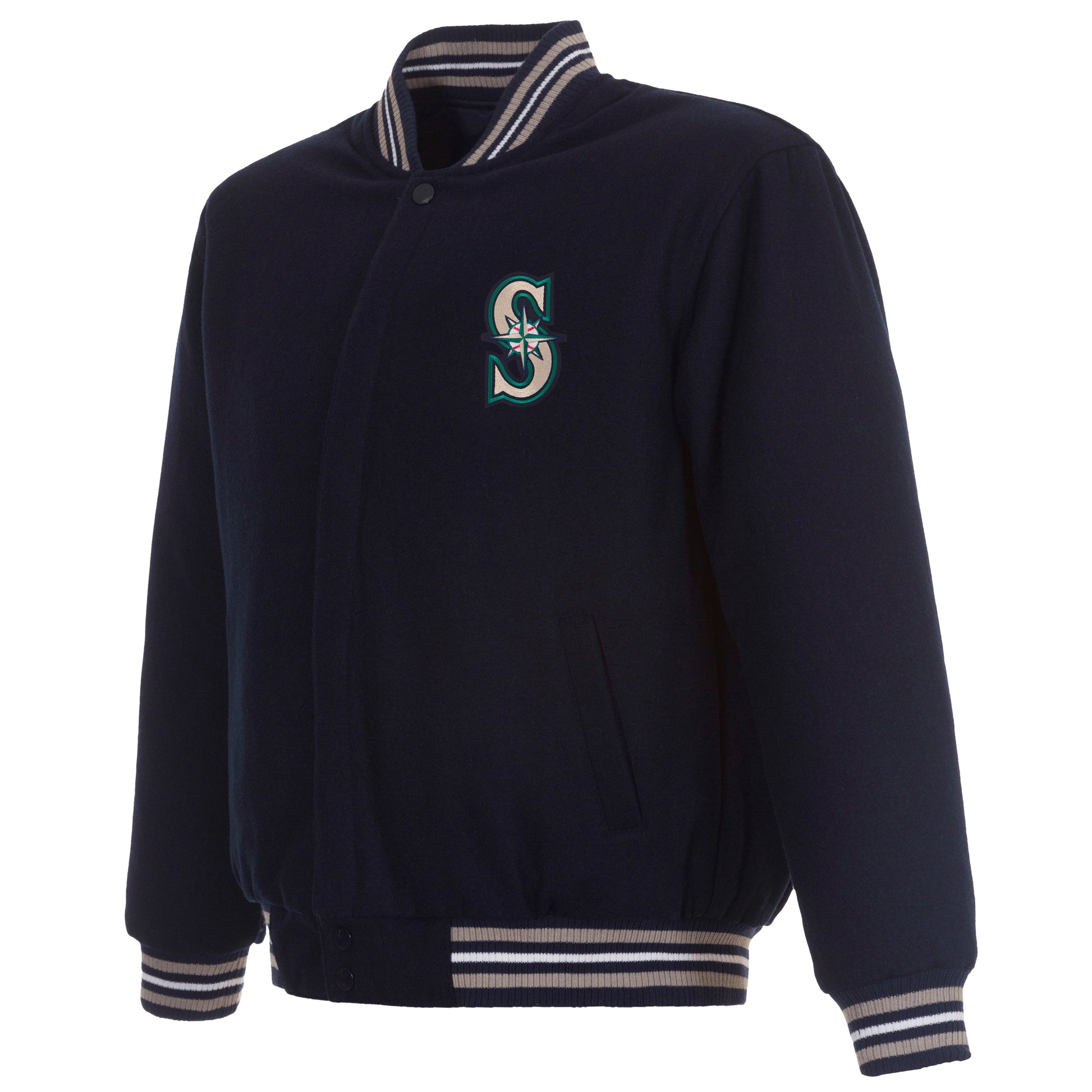 Seattle Mariners All Wool Jacket with nylon lining in navy with embroidered logos. Assembled in the USA. 55% wool 45% polyester body. Snap button closure.