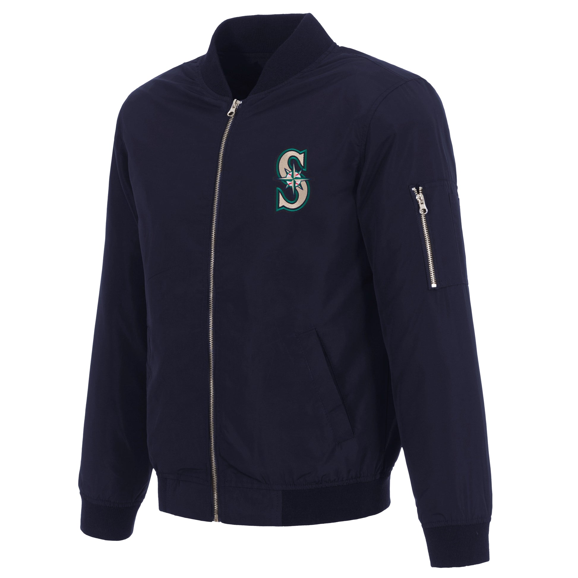 Seattle Mariners nylon bomber in navy with embroidered logos.