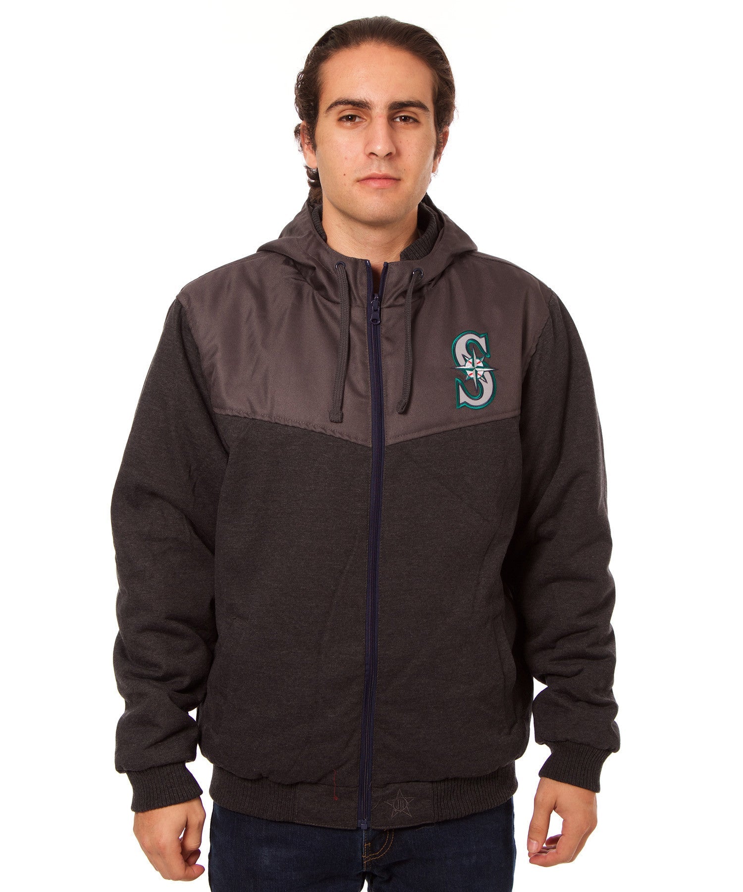 Seattle Mariners reversible fleece hooded jacket in charcoal with polyester color-blocking and embroidered appliqué logos. Reverse side is nylon.