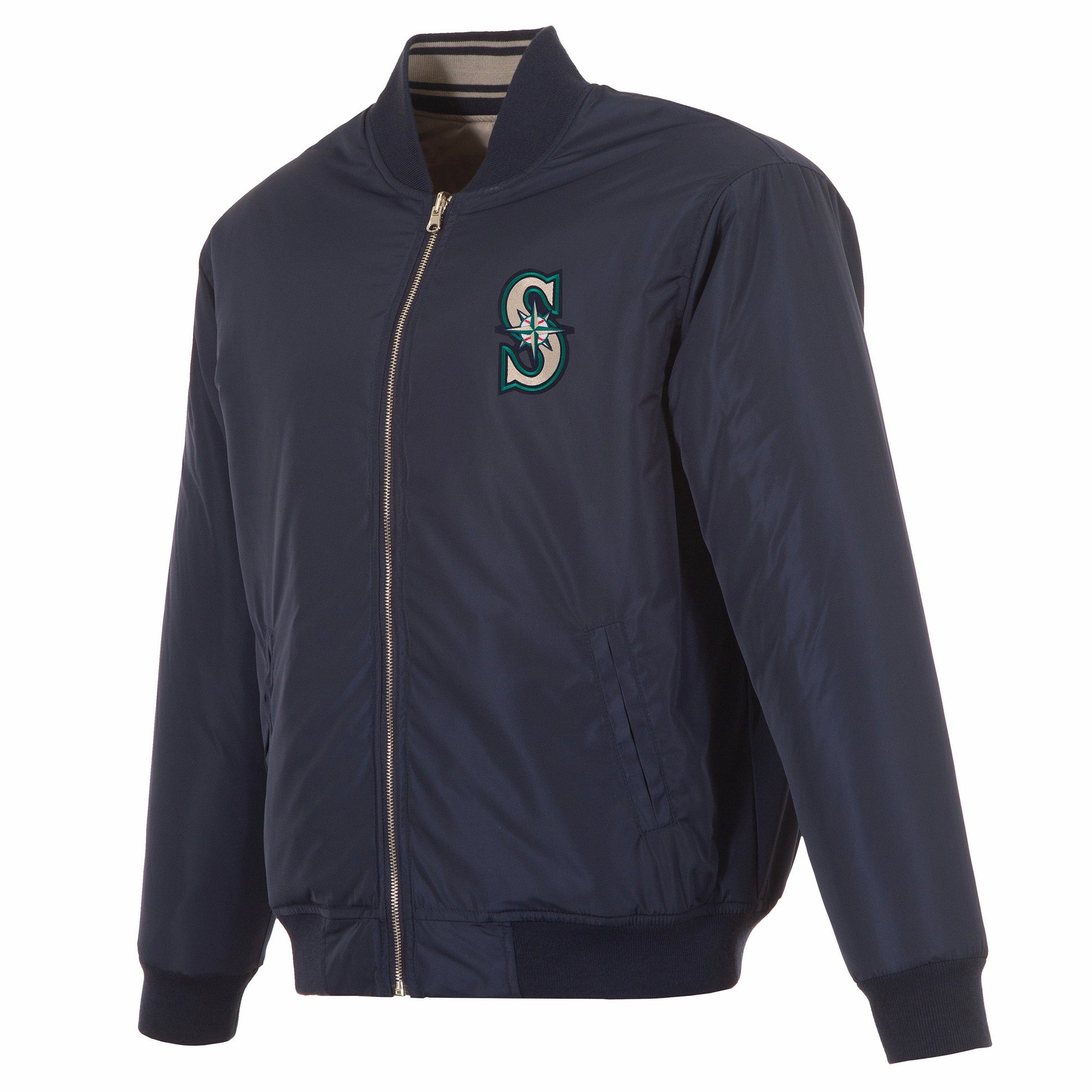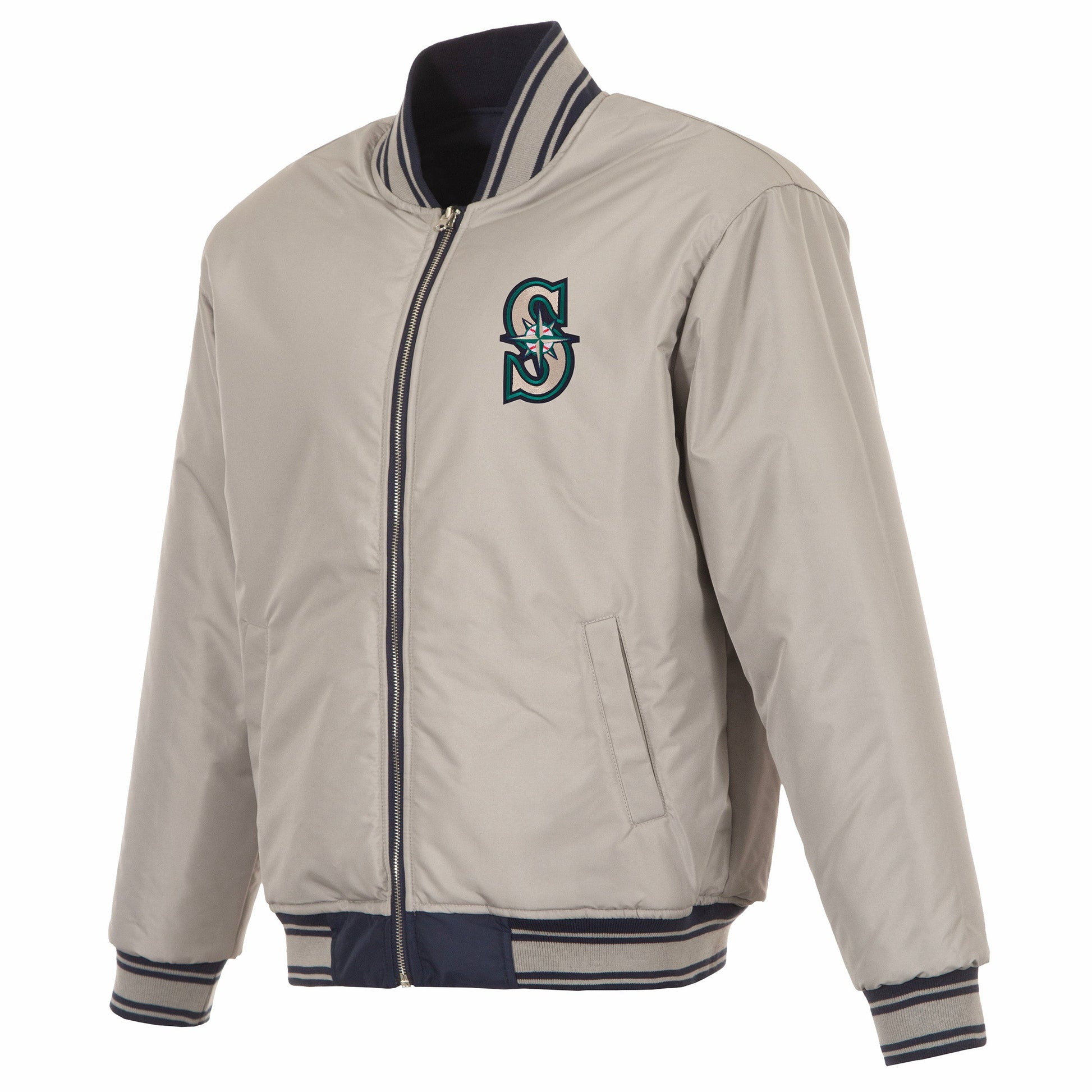 Seattle Mariners revrsible nylon bomber in navy and grey with embroidered logos. Assembled in the USA. 100% Nylon, full length zip front.