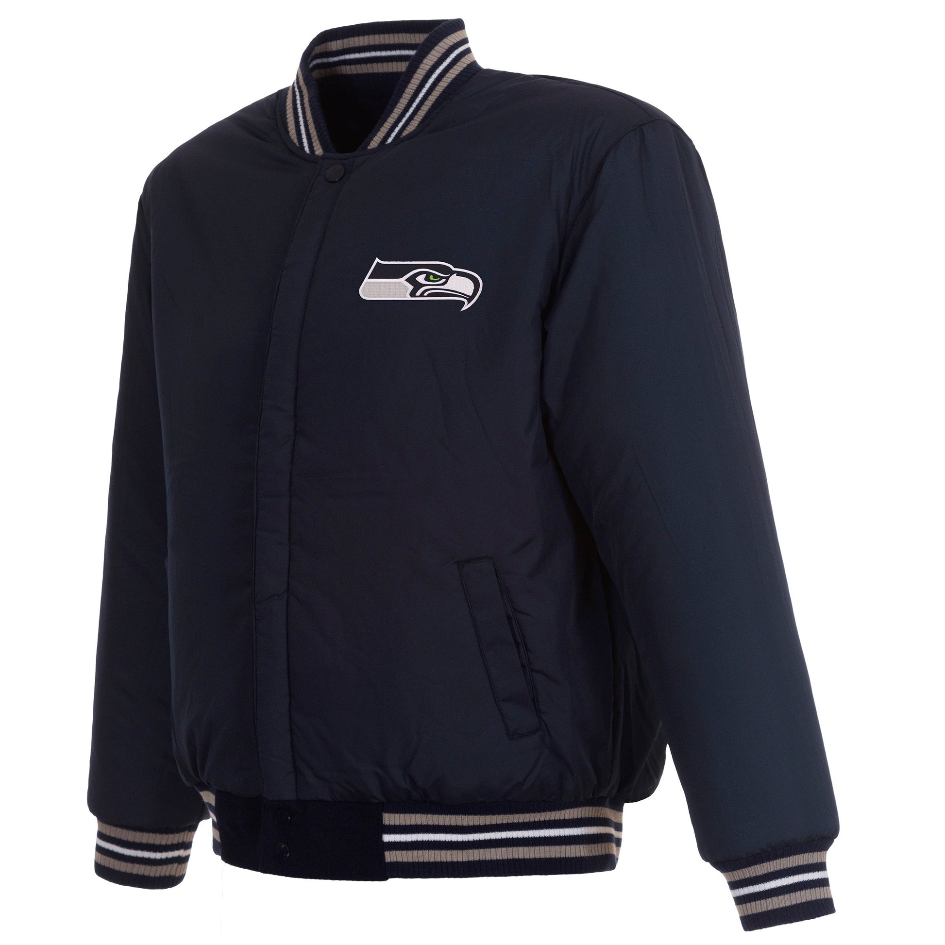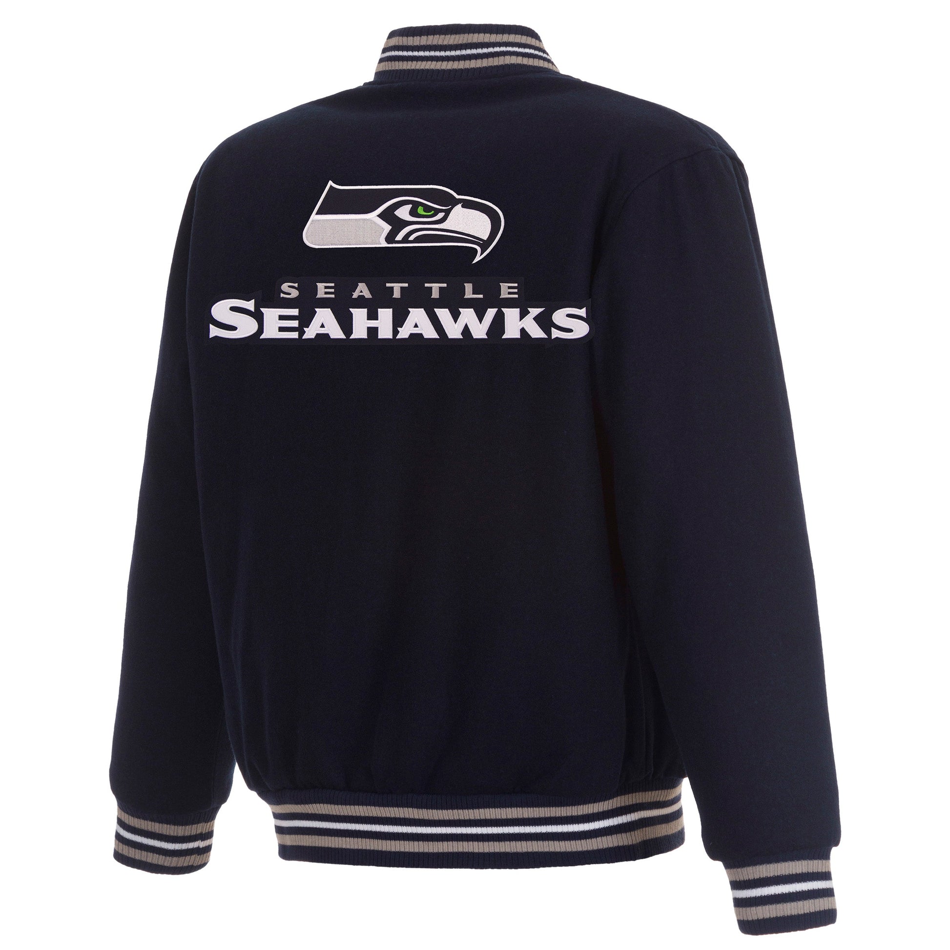 Seattle Seahawks All Wool Jacket with nylon lining in navy and grey with embroidered logos. Assembled in the USA. 55% wool 45% polyester body. Snap button closure.