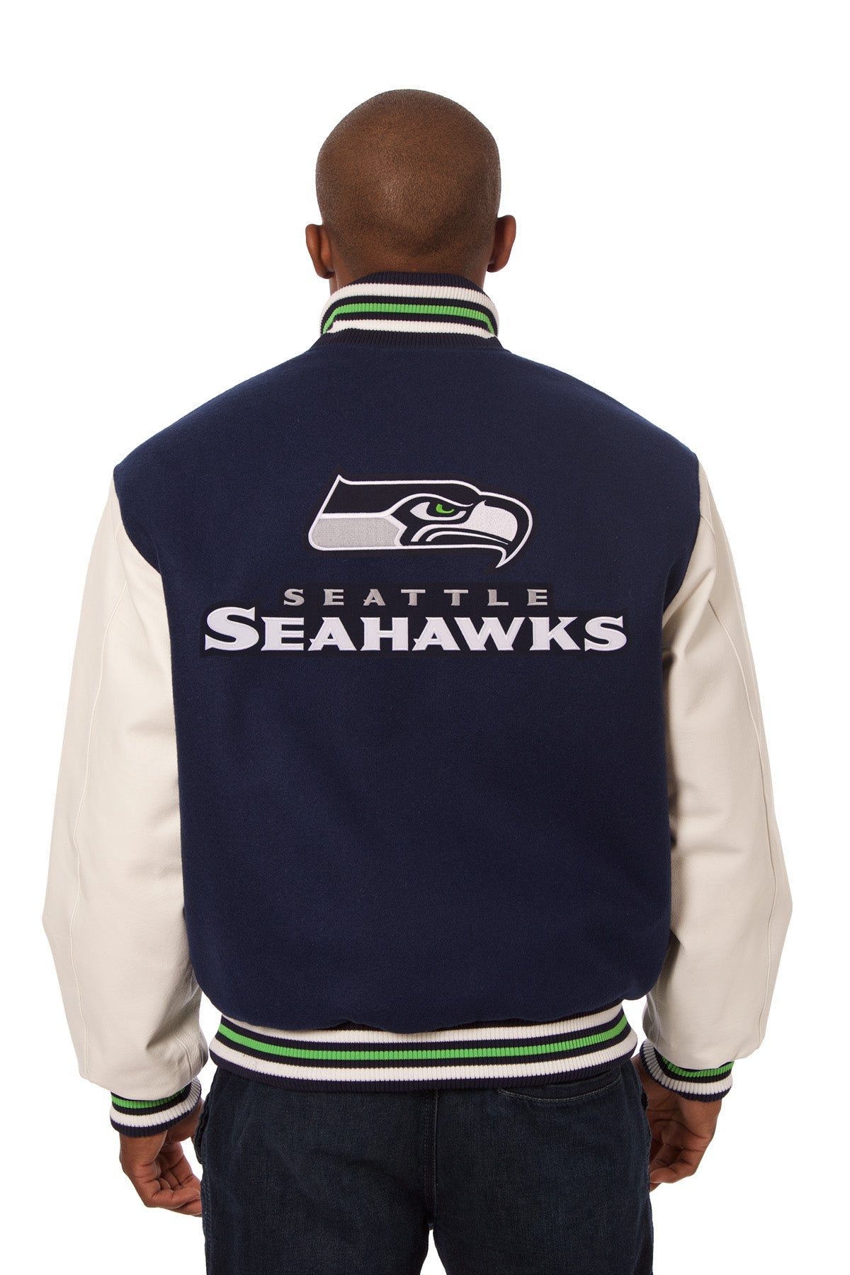 Seattle Seahawks embroidered wool and leather varsity jacket in navy and white with navy, green and white ribbing.
