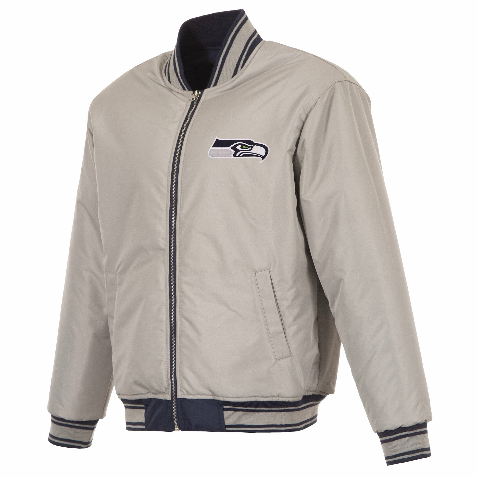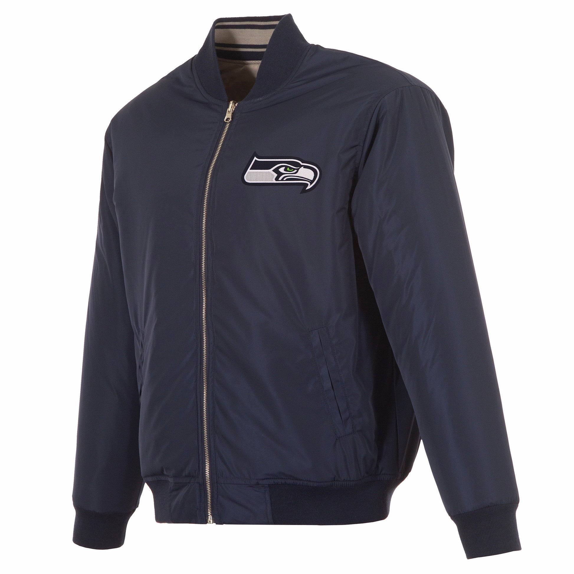 Seattle Seahawks reversible nylon bomber in navy and grey with embroidered logos. Assembled in the USA. 100% Nylon, full length zip front.