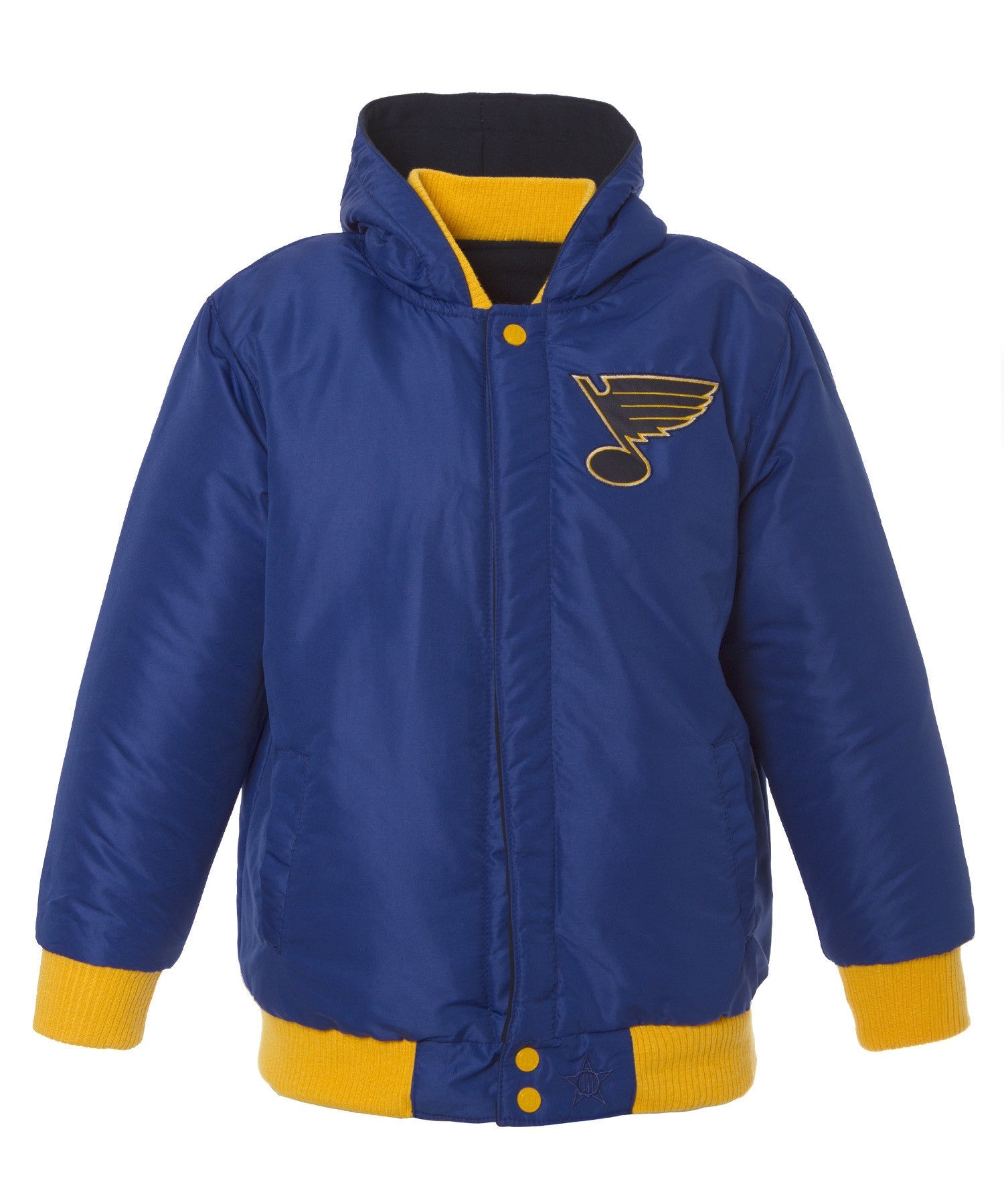 St. Louis Blues kid's reversible fleece hooded jacket in navy-royal with embroidered appliqué logos. Reverse side is nylon.