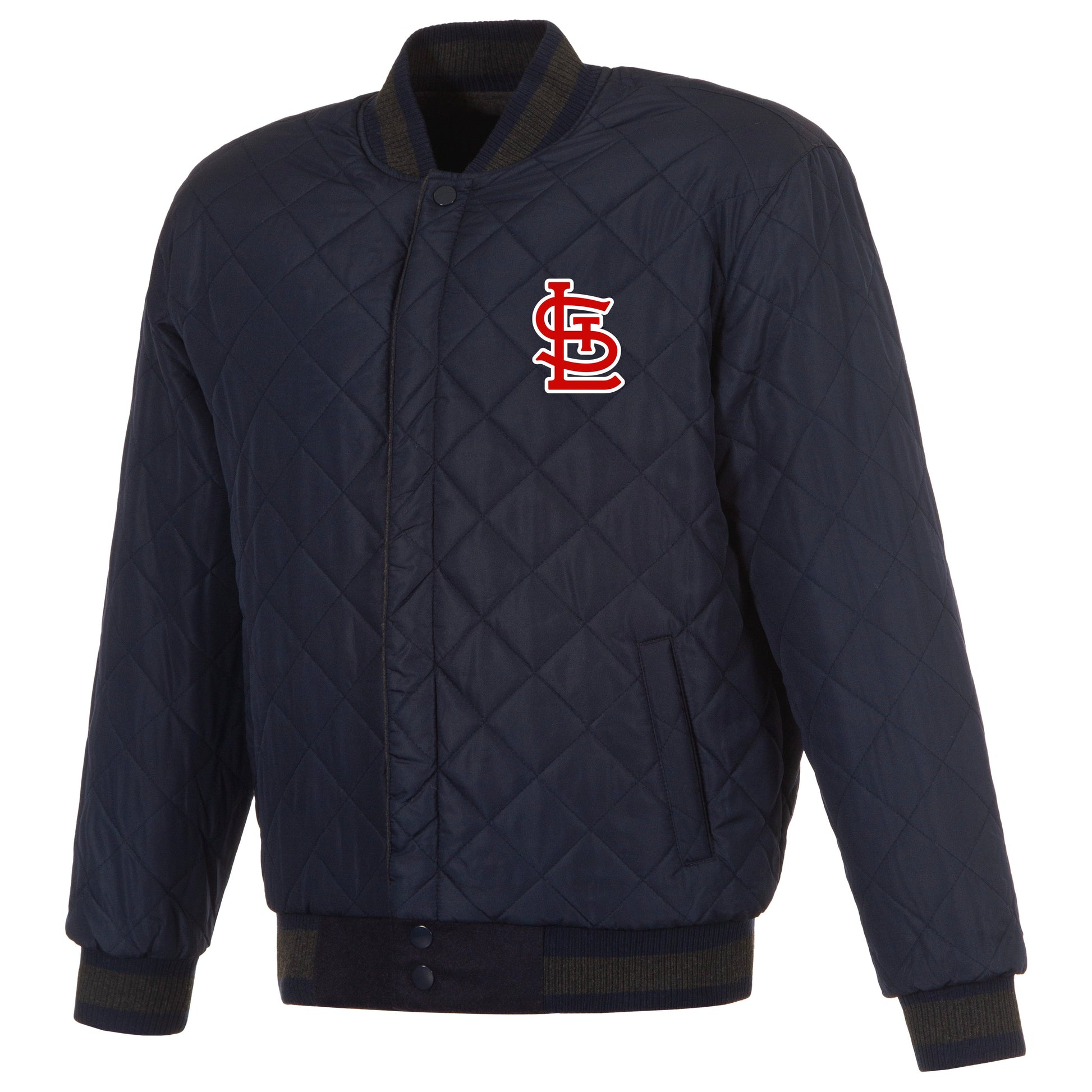 St. Louis Cardinals reversible wool body and leather sleeves jacket in charcoal and navy with quilted lining and embroidered appliqué logos.