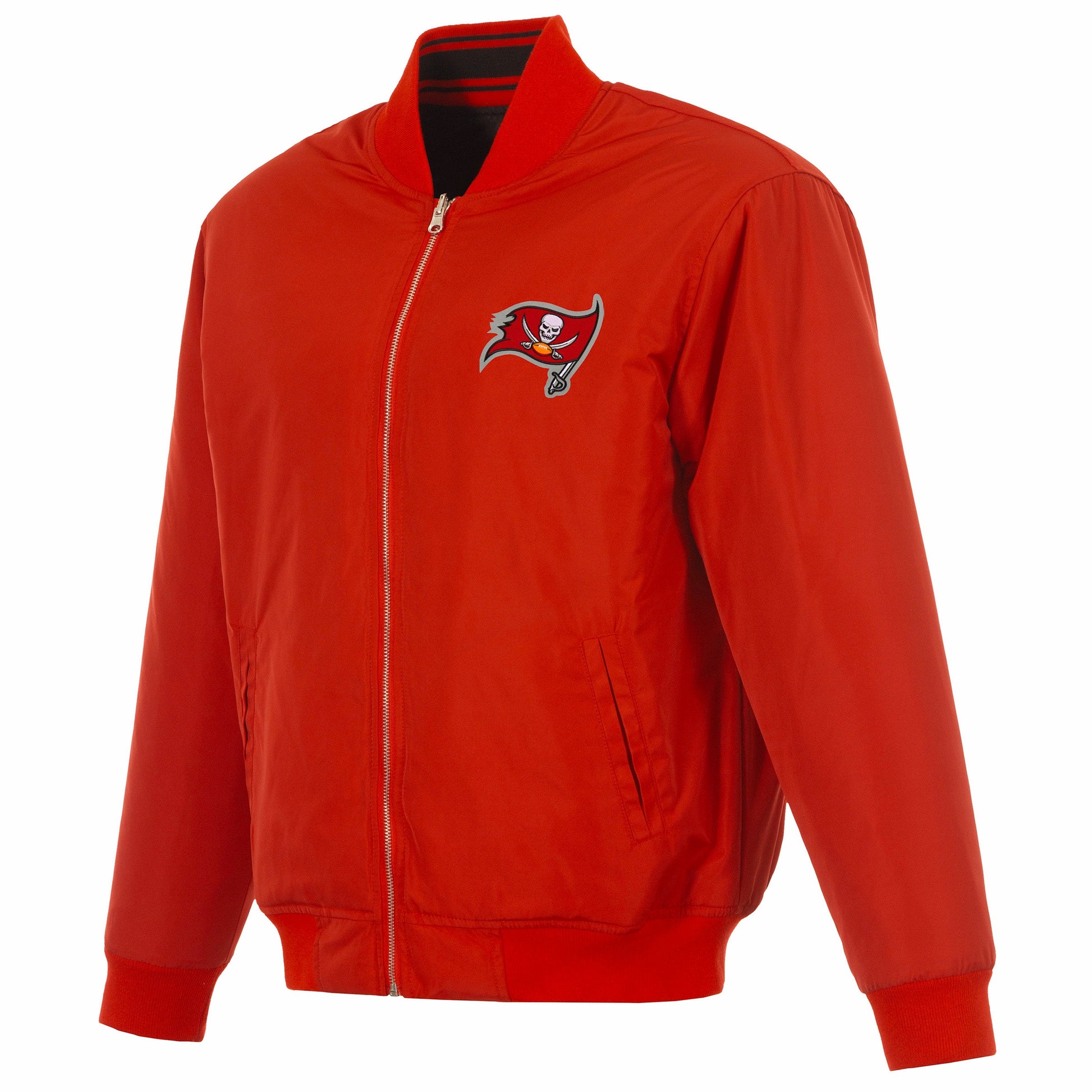 Tampa Bay Buccaneers Reversible Flight Jacket in red and black with embroidered logos. Assembled in the USA. 100% Nylon, full length zip front.