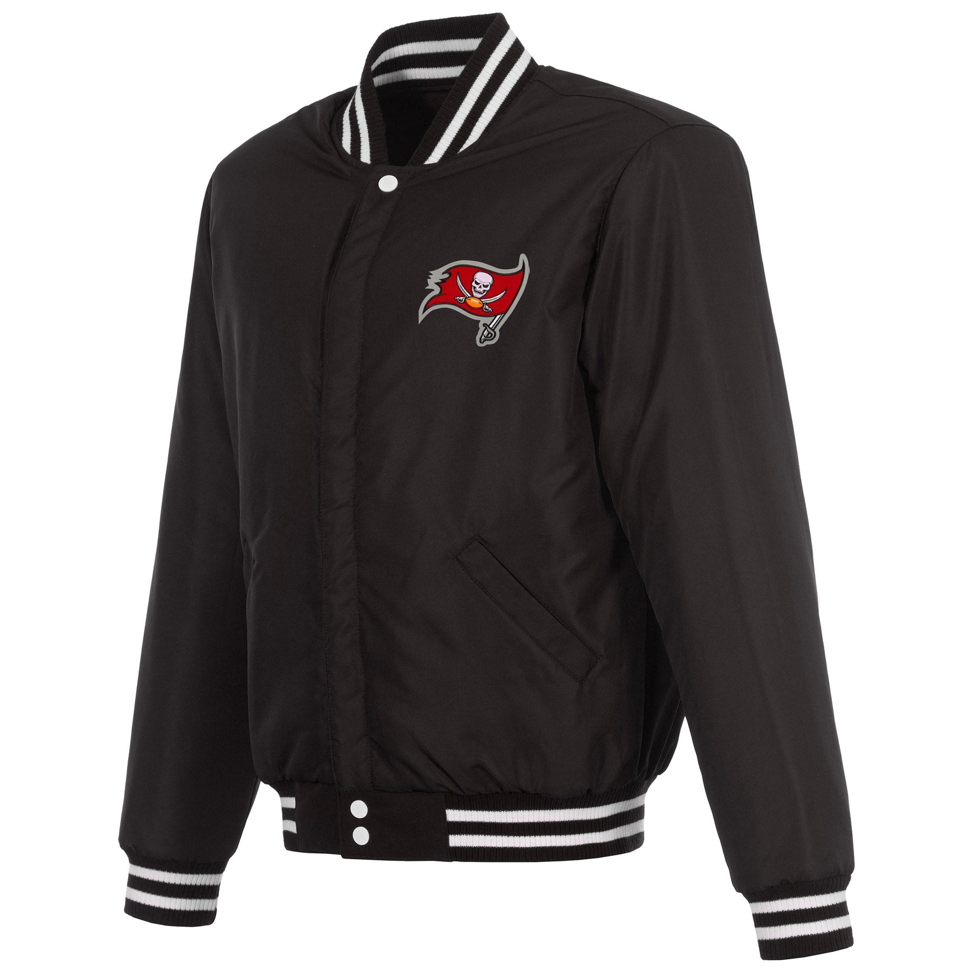 Tampa Bay Buccaneers reversible fleece jacket with faux leather sleeves in black and white with embroidered logos. Assembled in the USA. 100% polyester body, faux leather sleeves, snap button closure.