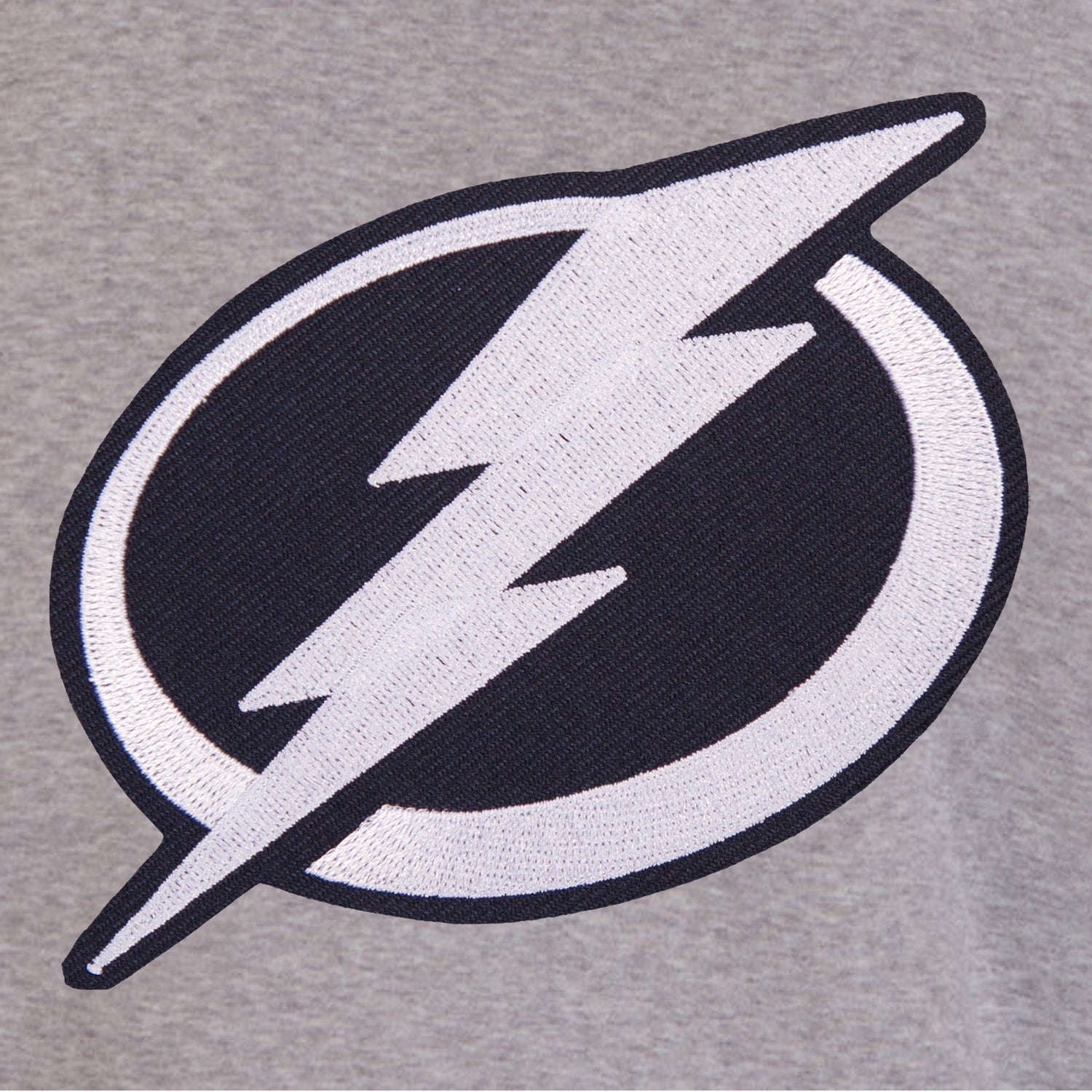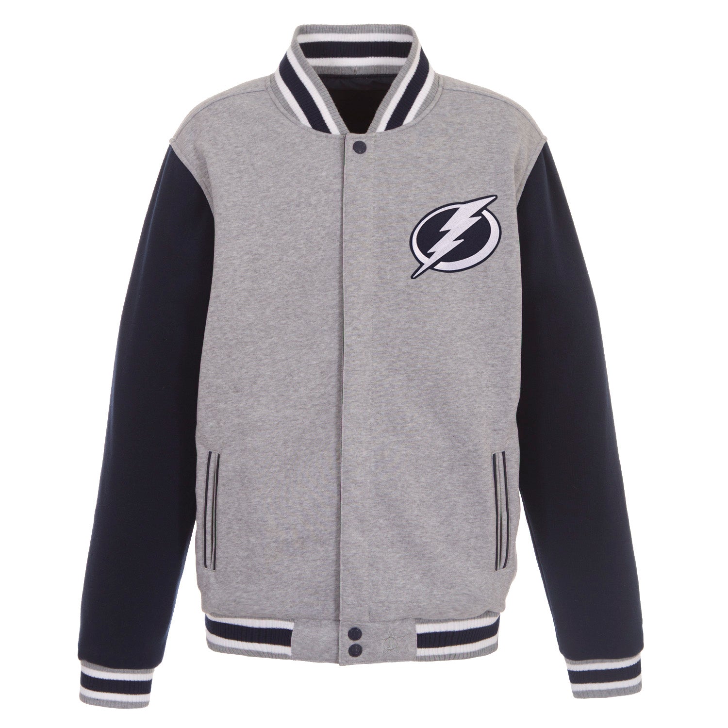 Tampa Bay Lightning reversible two-tone fleece jacket in grey and black with embroidered logos. Assembled in the USA. 100% polyester body, reverse nylon side, snap button closure.