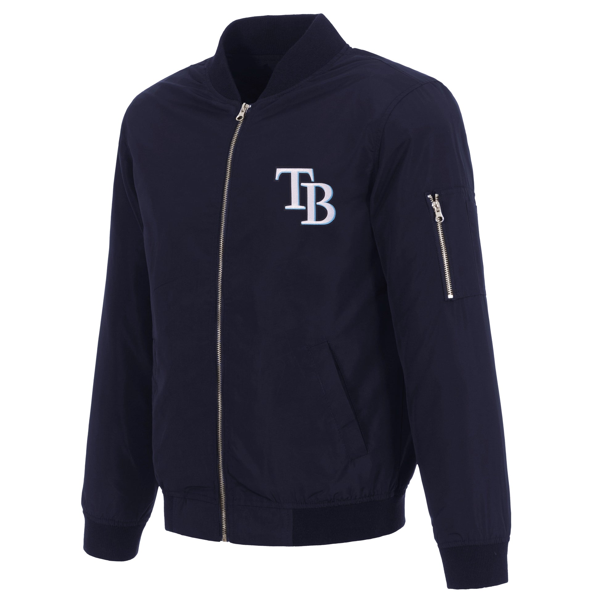 Tampa Bay Rays nylon bomber in navy with embroidered logos.