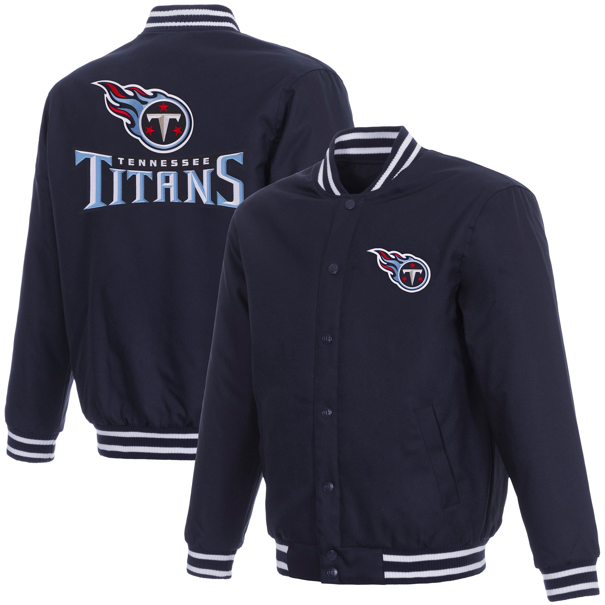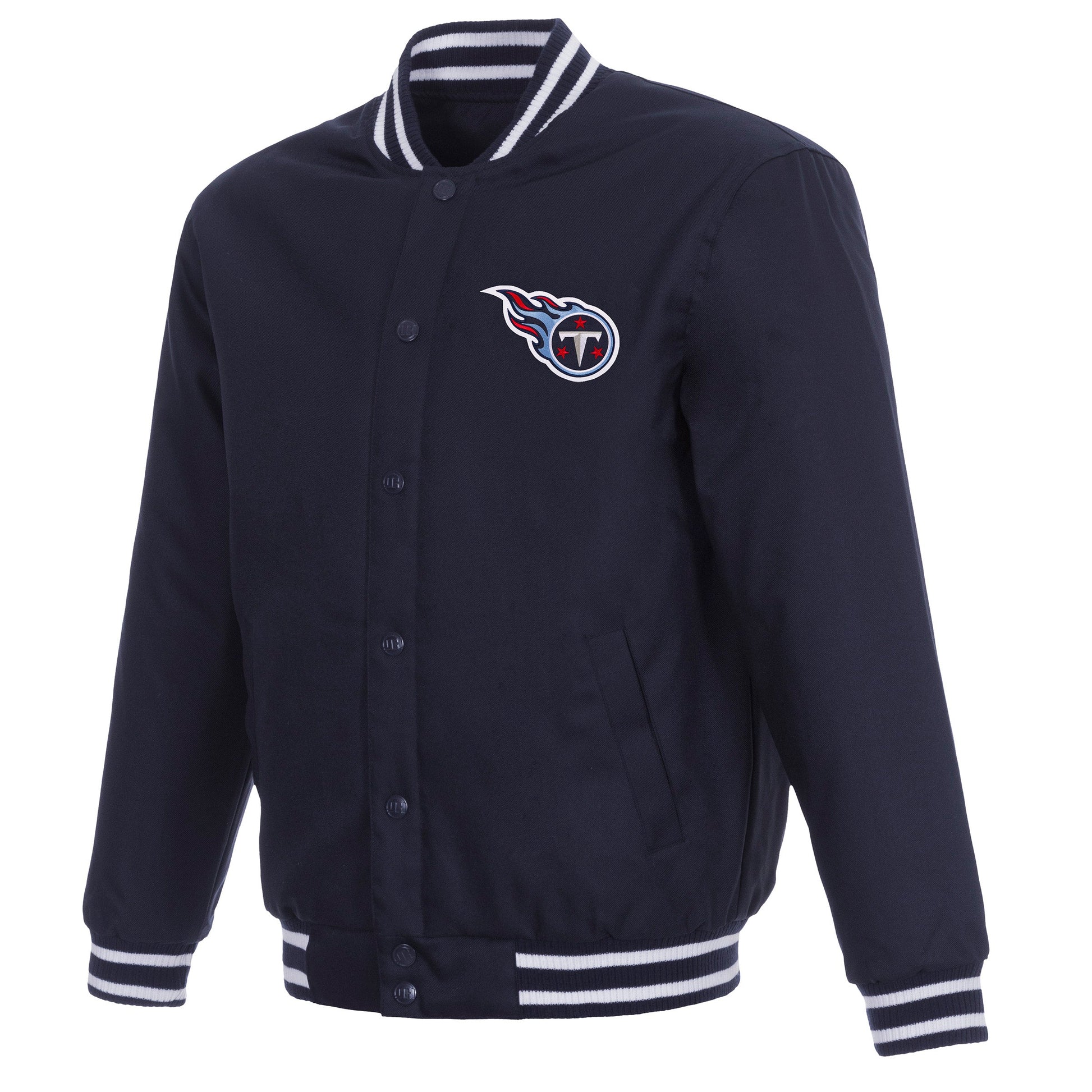Tennessee Titans poly-twill jacket in navy with quilted nylon lining and embroidered appliqué logos.