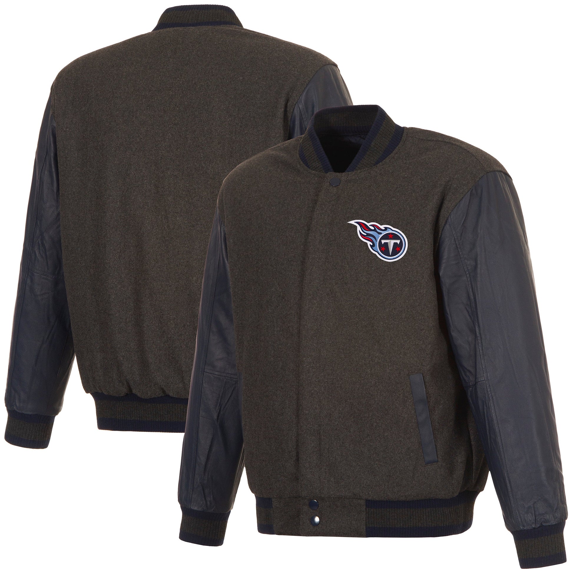 Tennessee Titans reversible wool body and leather sleeves jacket in charcoal and navy with quilted lining and embroidered appliqué logos.