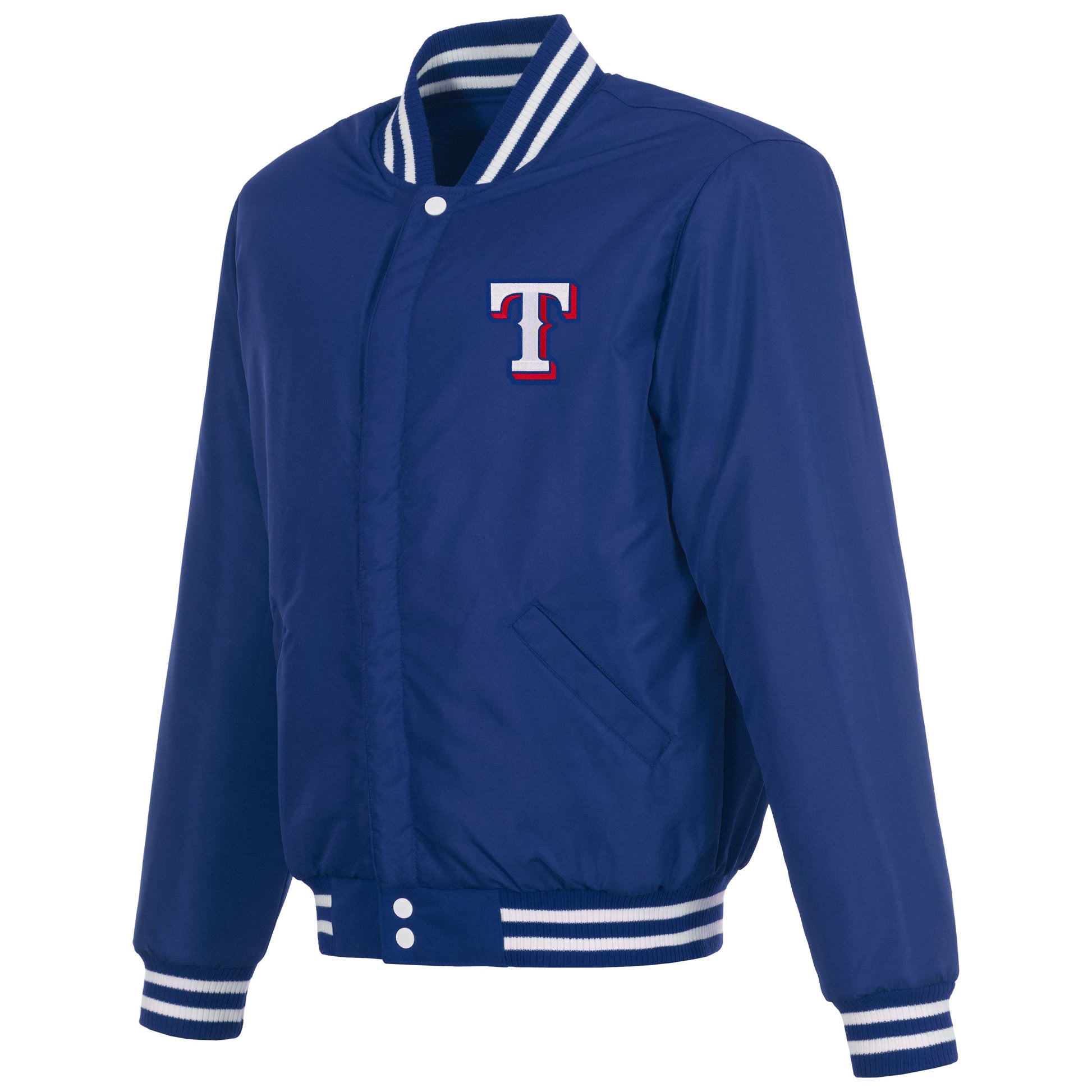 Texas Rangers reversible fleece jacket with Faux Leather sleeves in royal-white with nylon lining and embroidered logos.