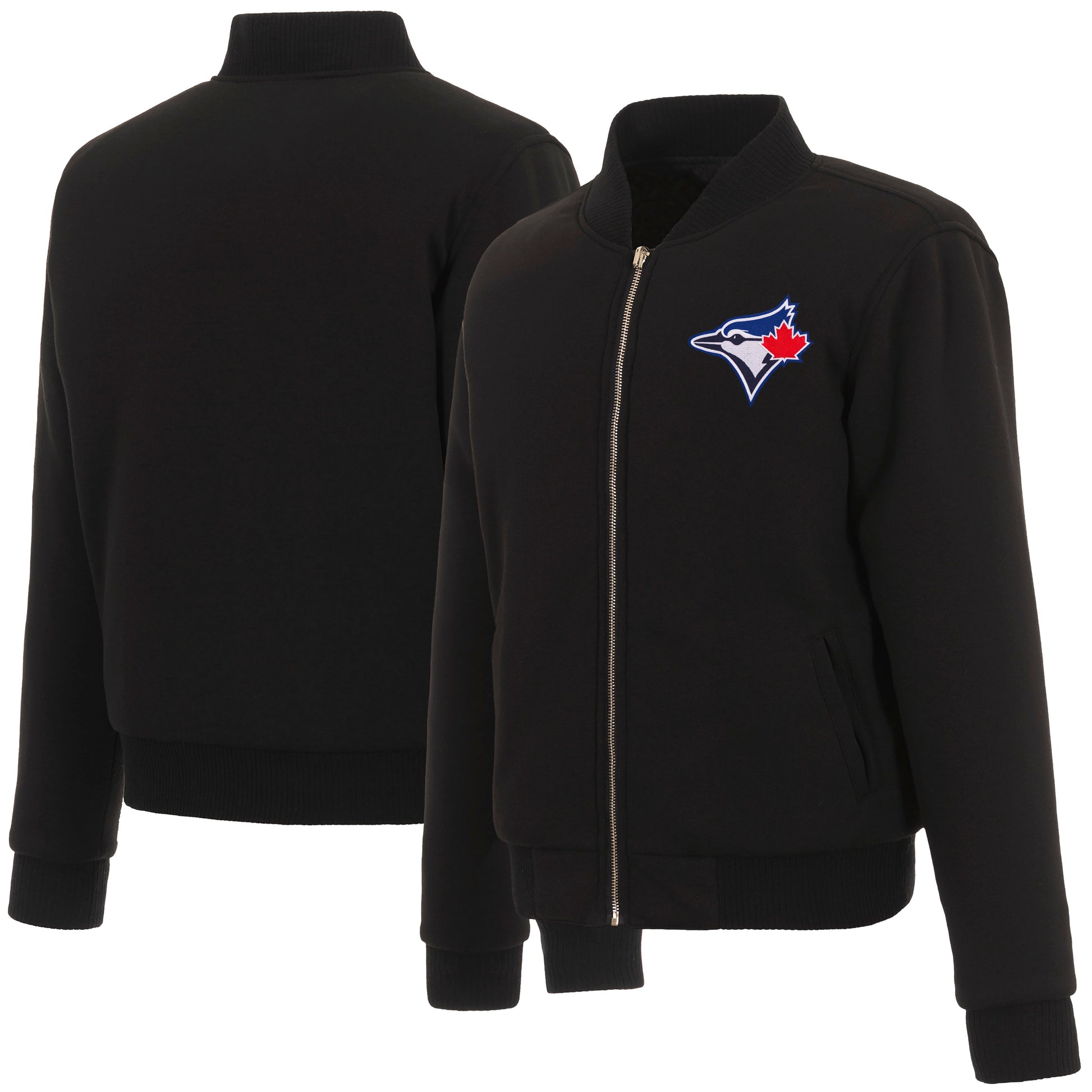 Toronto Blue Jays Ladies reversible fleece jacket in black with embroidered logos. Assembled in the USA. 100% polyester body, reverse nylon side, metal zip closure.