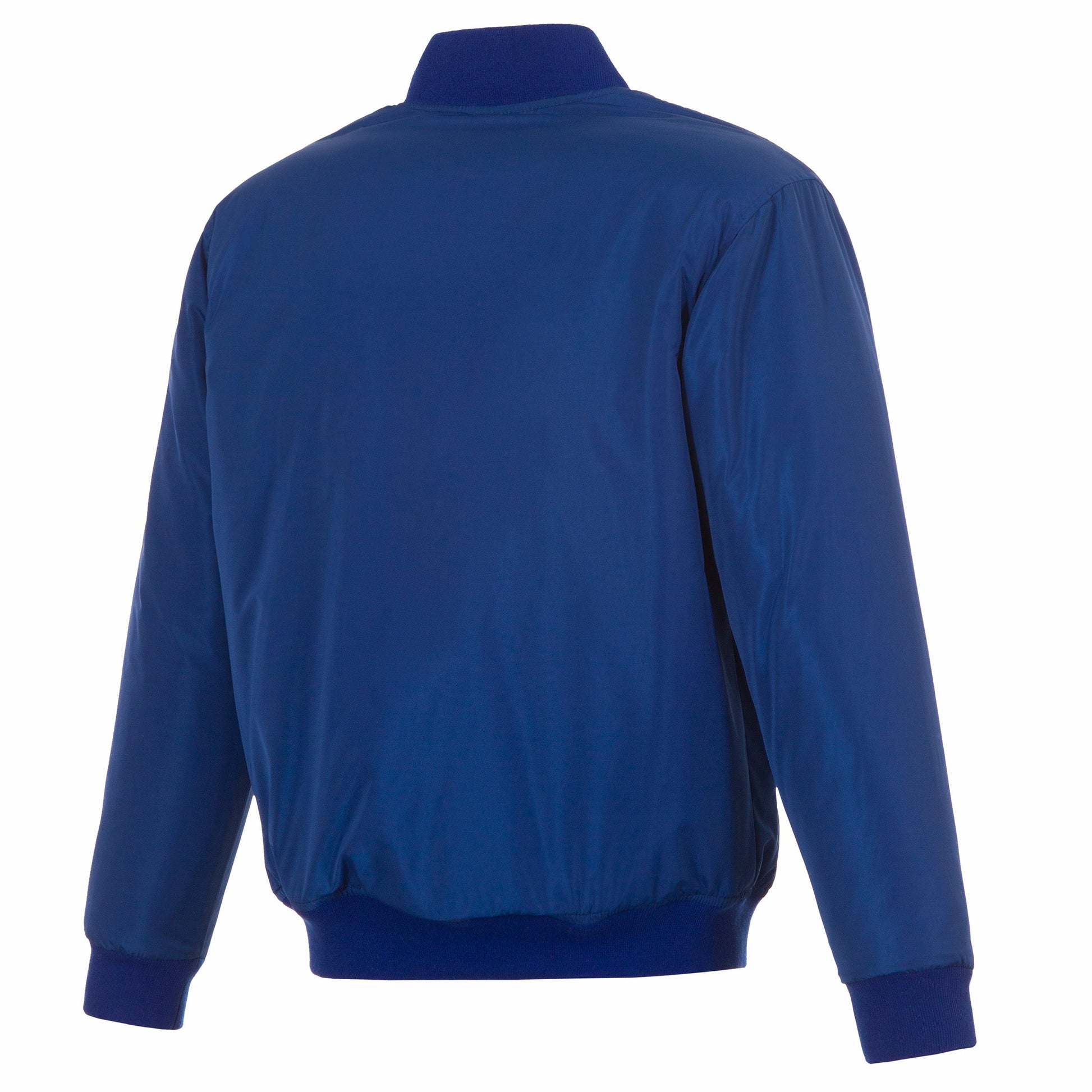 Toronto Blue Jays reversible nylon bomber in royal and white with embroidered logos. Assembled in the USA. 100% Nylon, full length zip front.