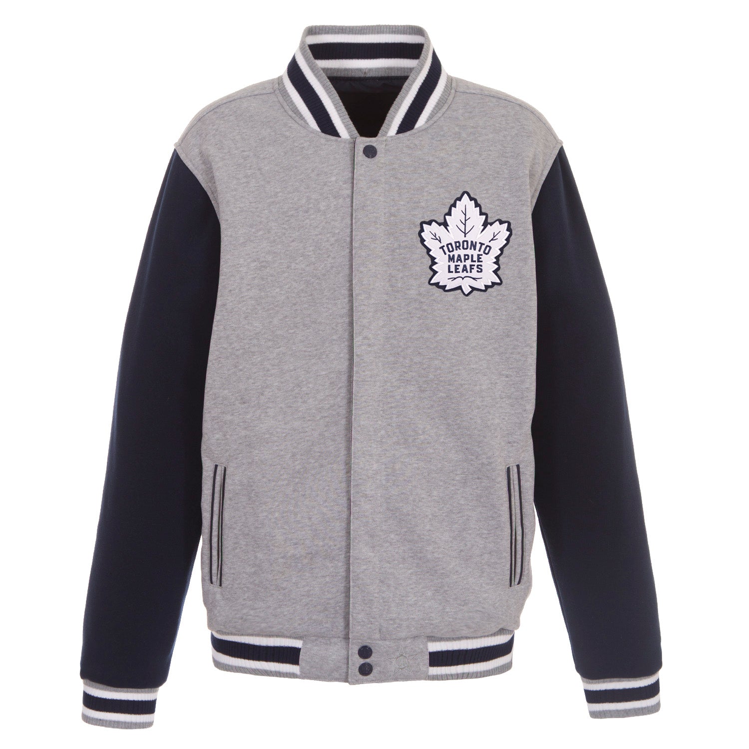 Toronto Maple Leafs reversible two-tone fleece jacket in gray-navy with nylon lining and embroidered logos.