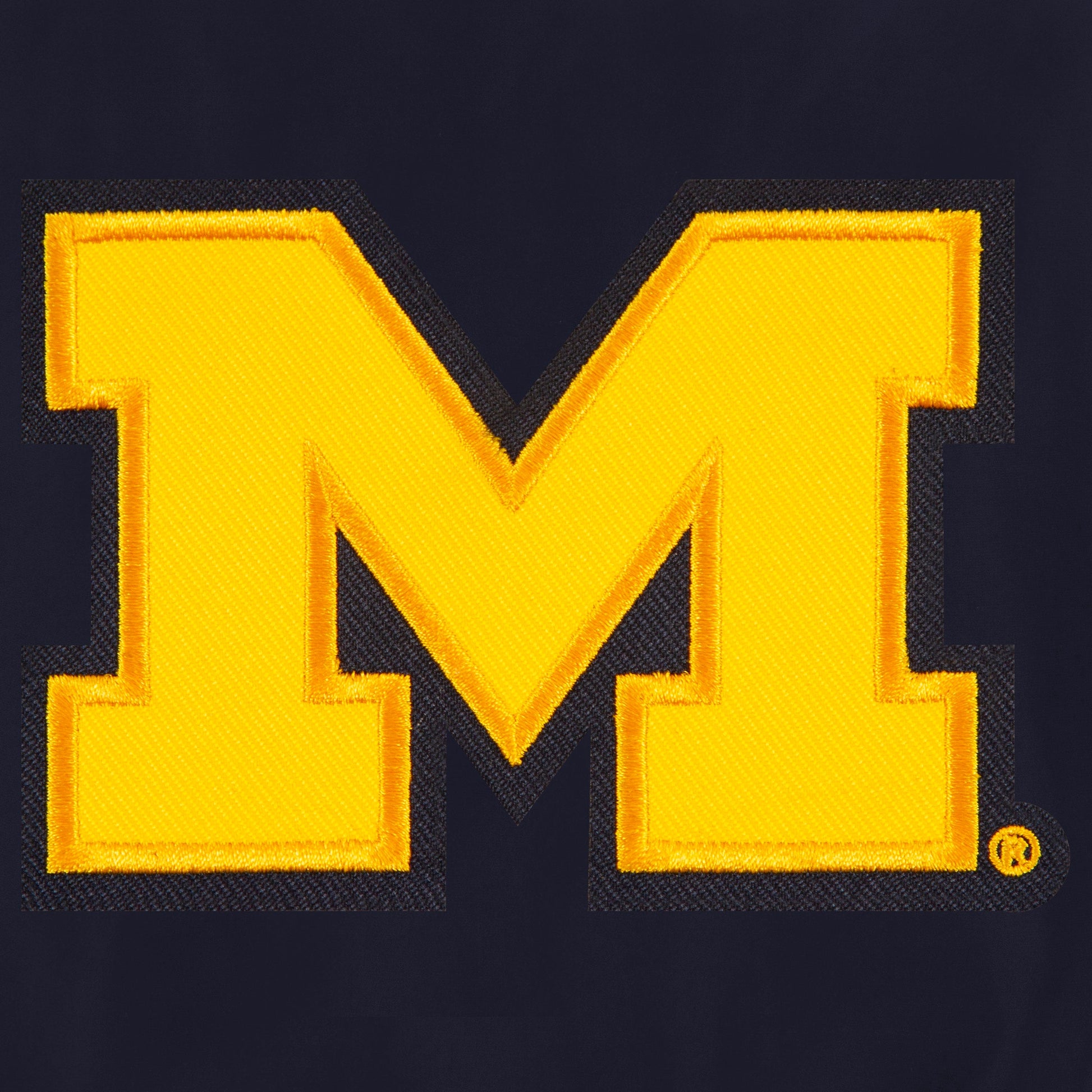 University of Michigan nylon bomber in navy with embroidered logos. Assembled in the USA. 100% Nylon, full length zip front.