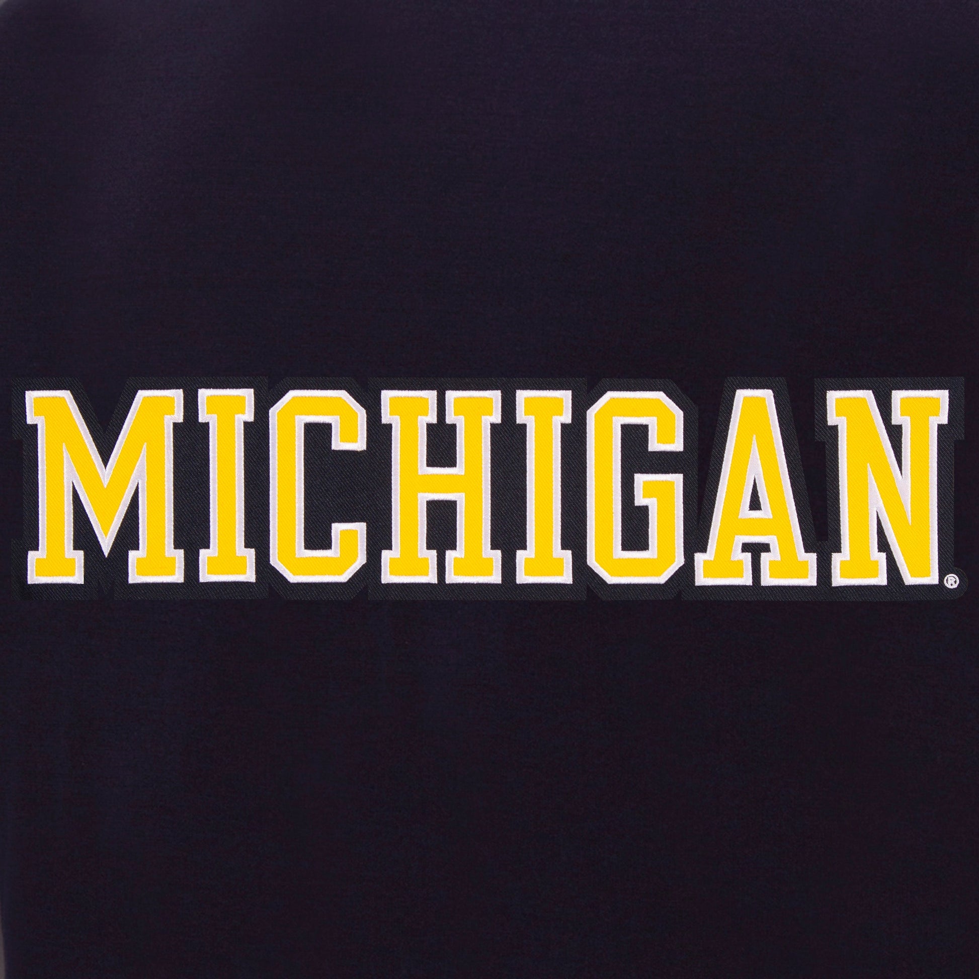 University of Michigan reversible fleece jacket with faux leather sleeves in navy and white with embroidered logos. Assembled in the USA. 100% polyester body, faux leather sleeves, snap button closure.