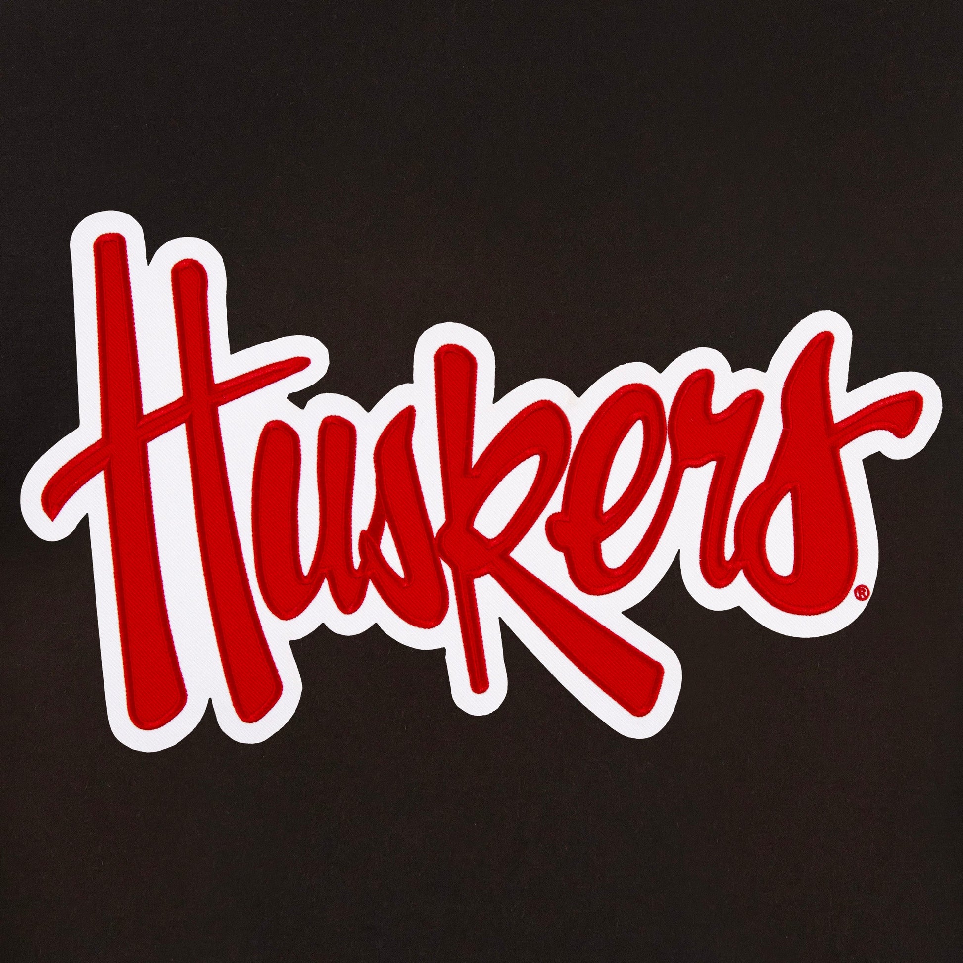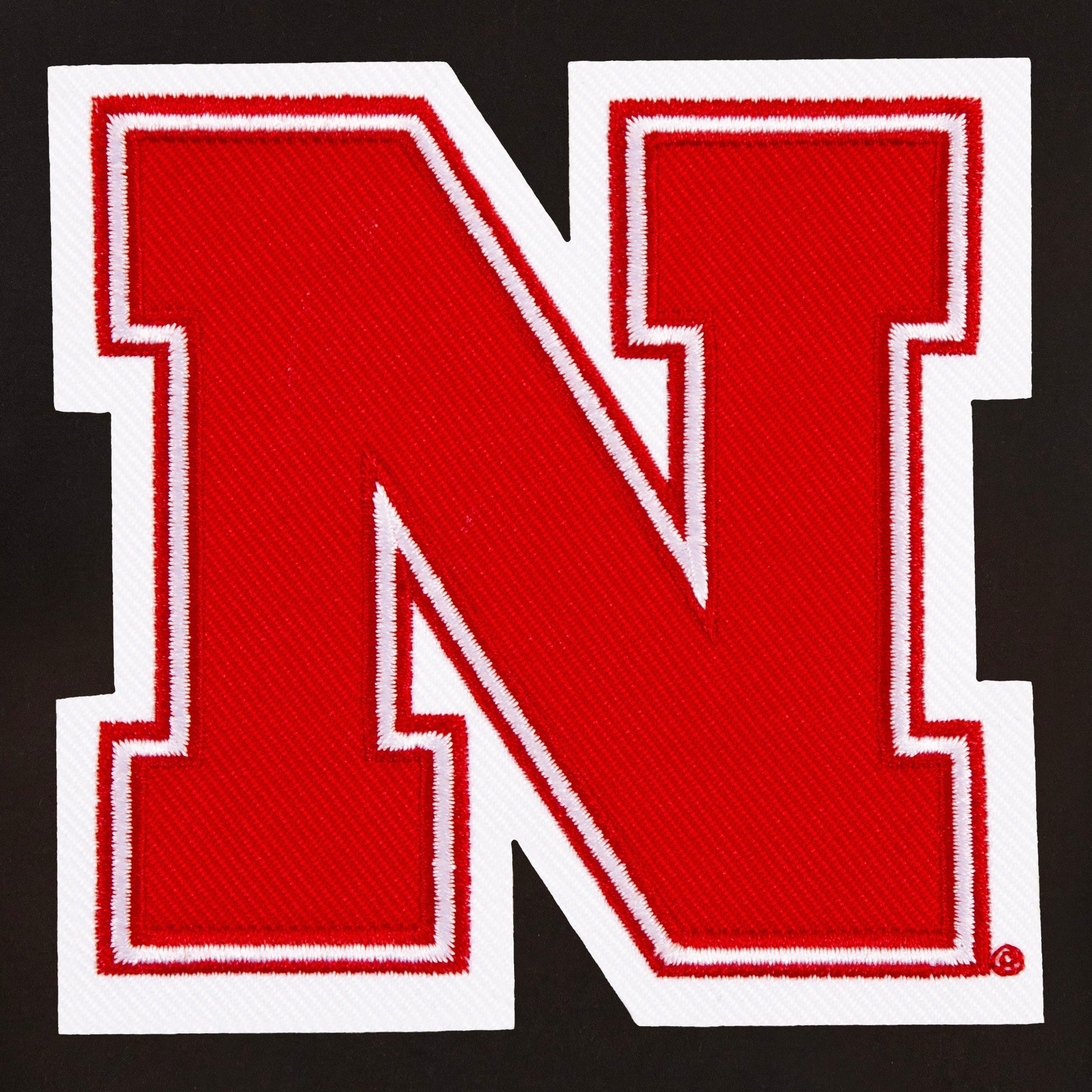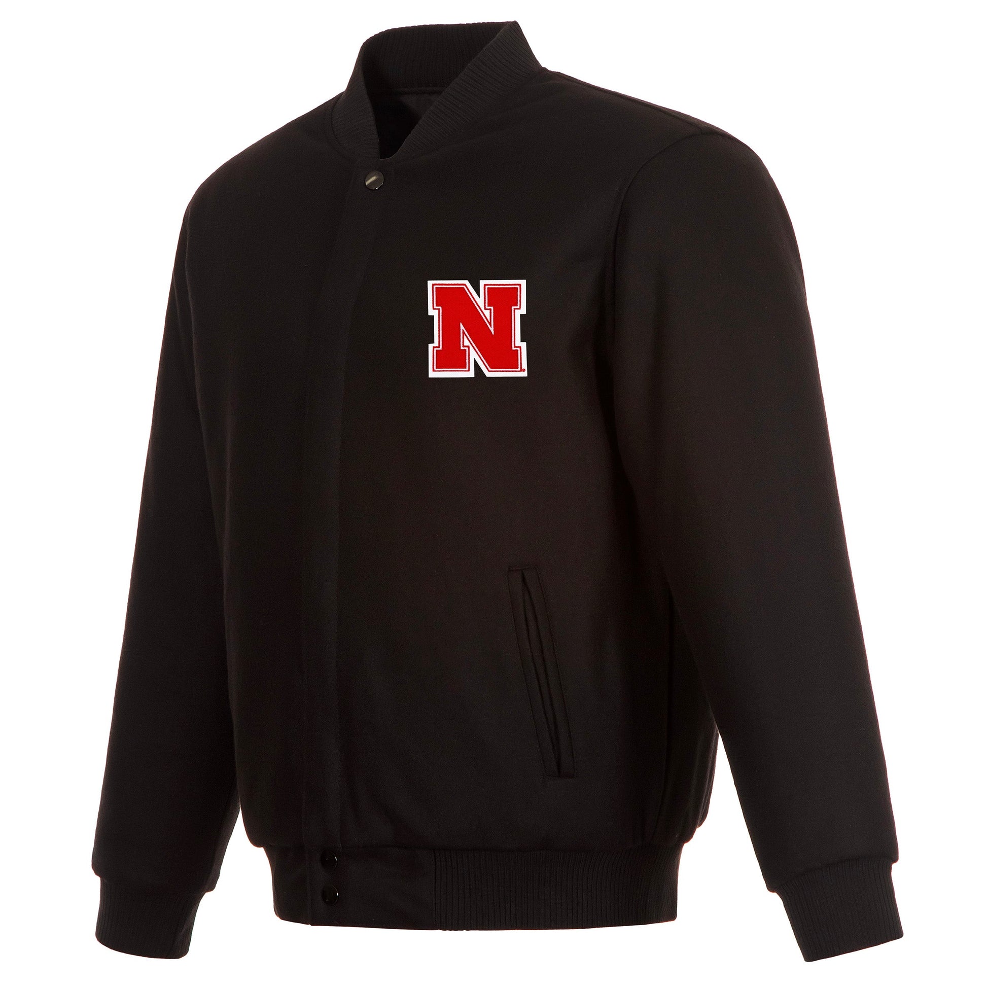 University of Nebraska All Wool Jacket with nylon lining in black with embroidered logos. Assembled in the USA. 55% wool 45% polyester body. Snap button closure.