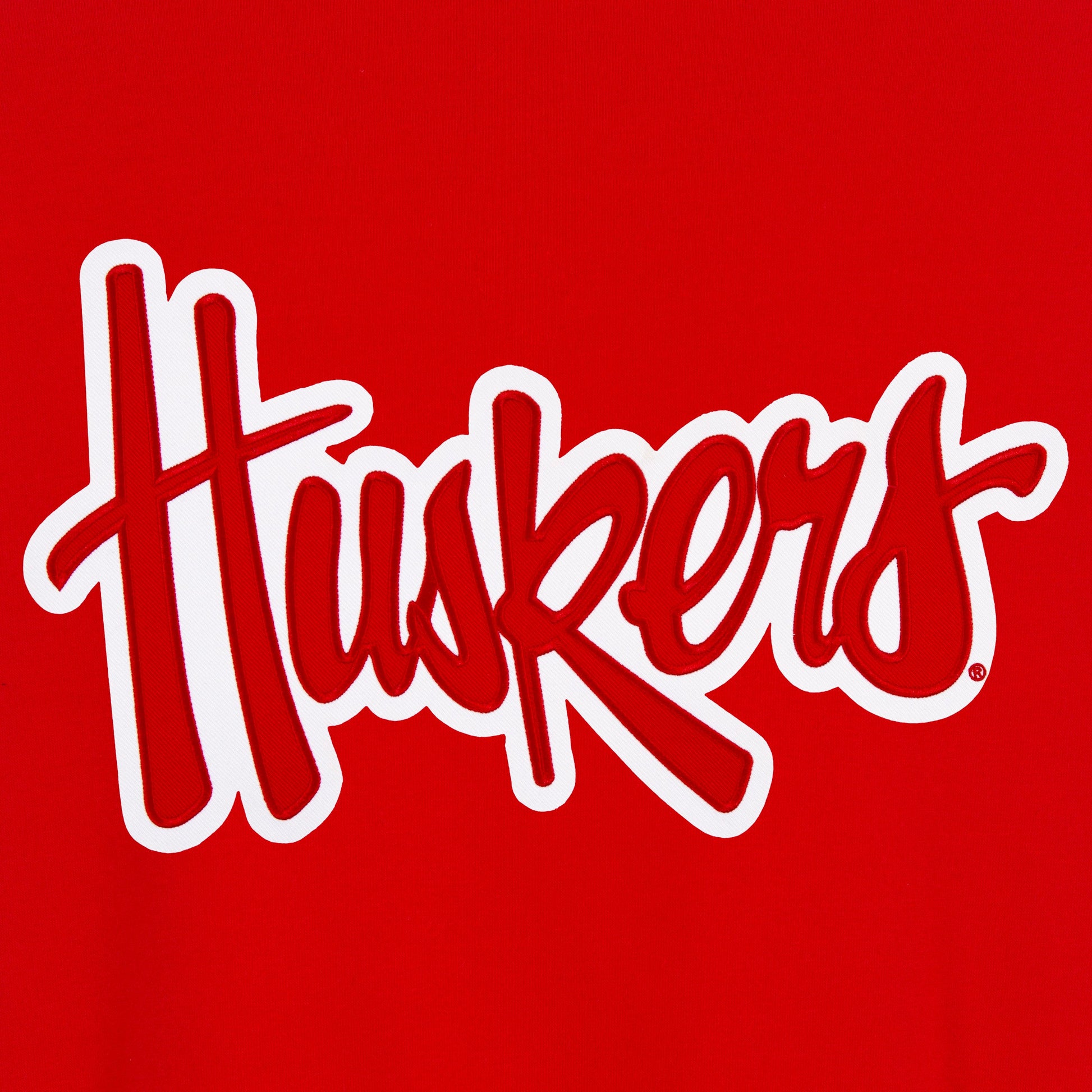 University of Nebraska reversible fleece jacket with faux leather sleeves in red and white with embroidered logos. Assembled in the USA. 100% polyester body, faux leather sleeves, snap button closure.