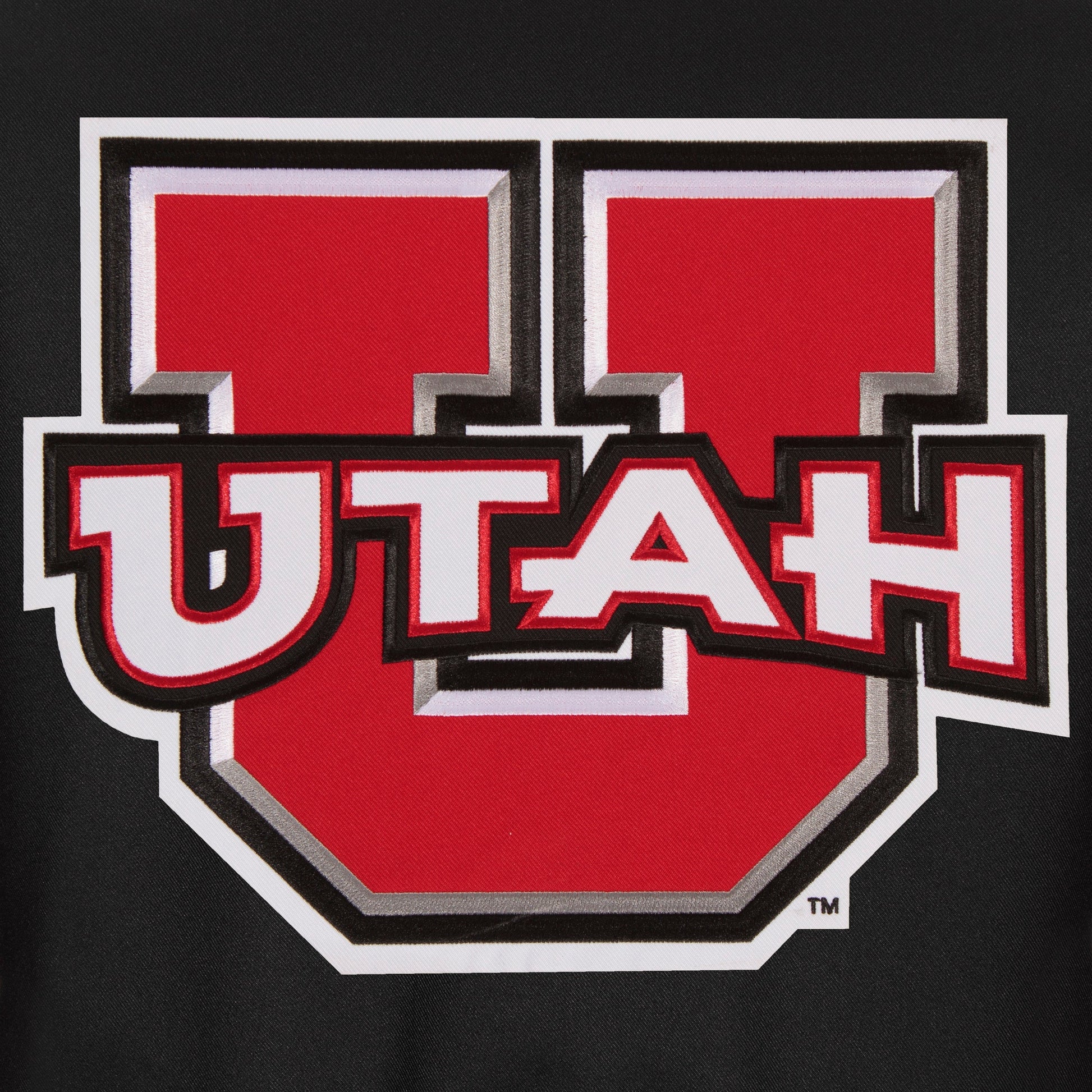 Poly-Twill Jacket with quilted nylon lining in black and red with embroidered logos. Assembled in the USA. 100% polyester body. Snap button closure.