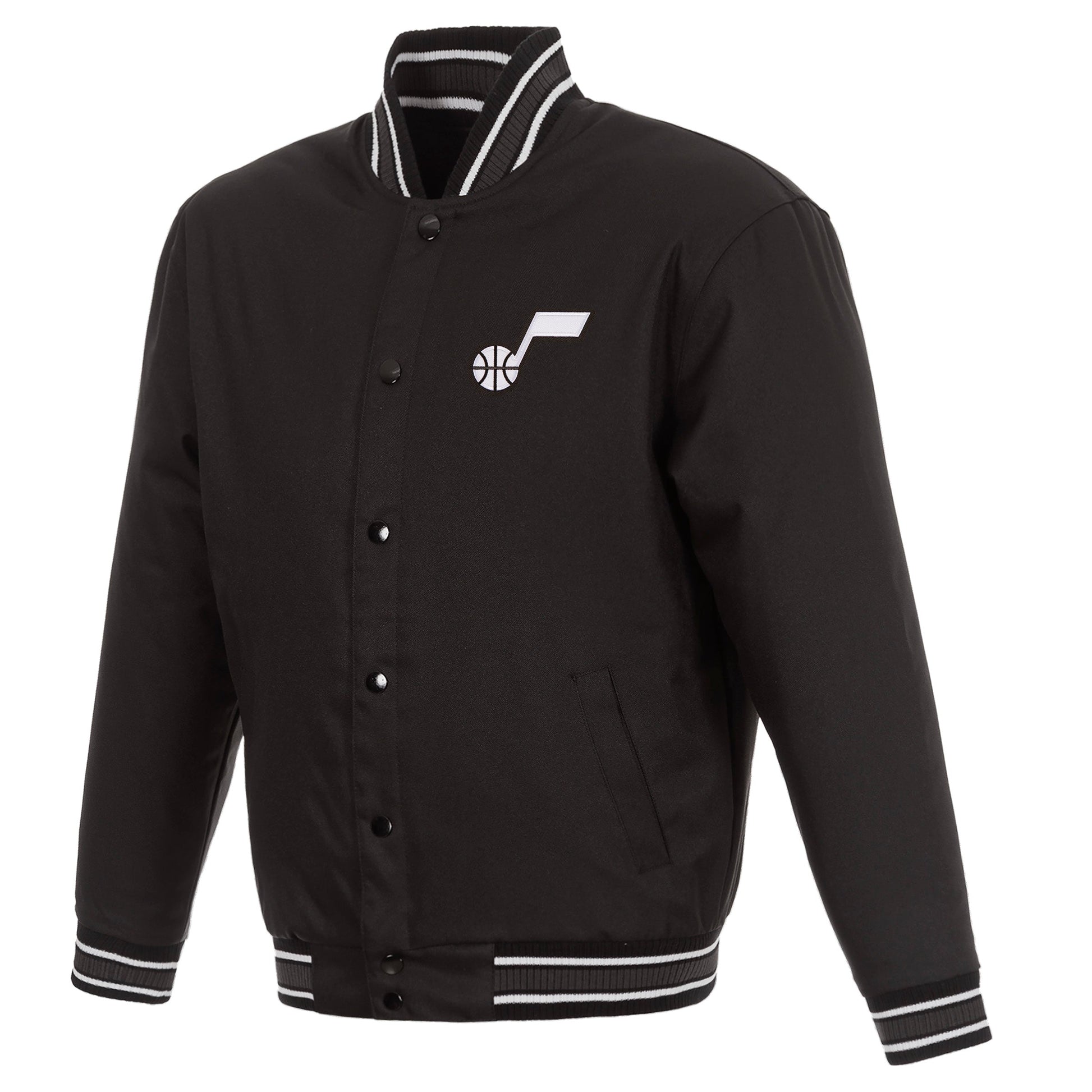 Utah Jazz Poly-Twill Jacket with nylon lining in black with embroidered logos. Assembled in the USA. 100% Polyester body. Snap button closure.