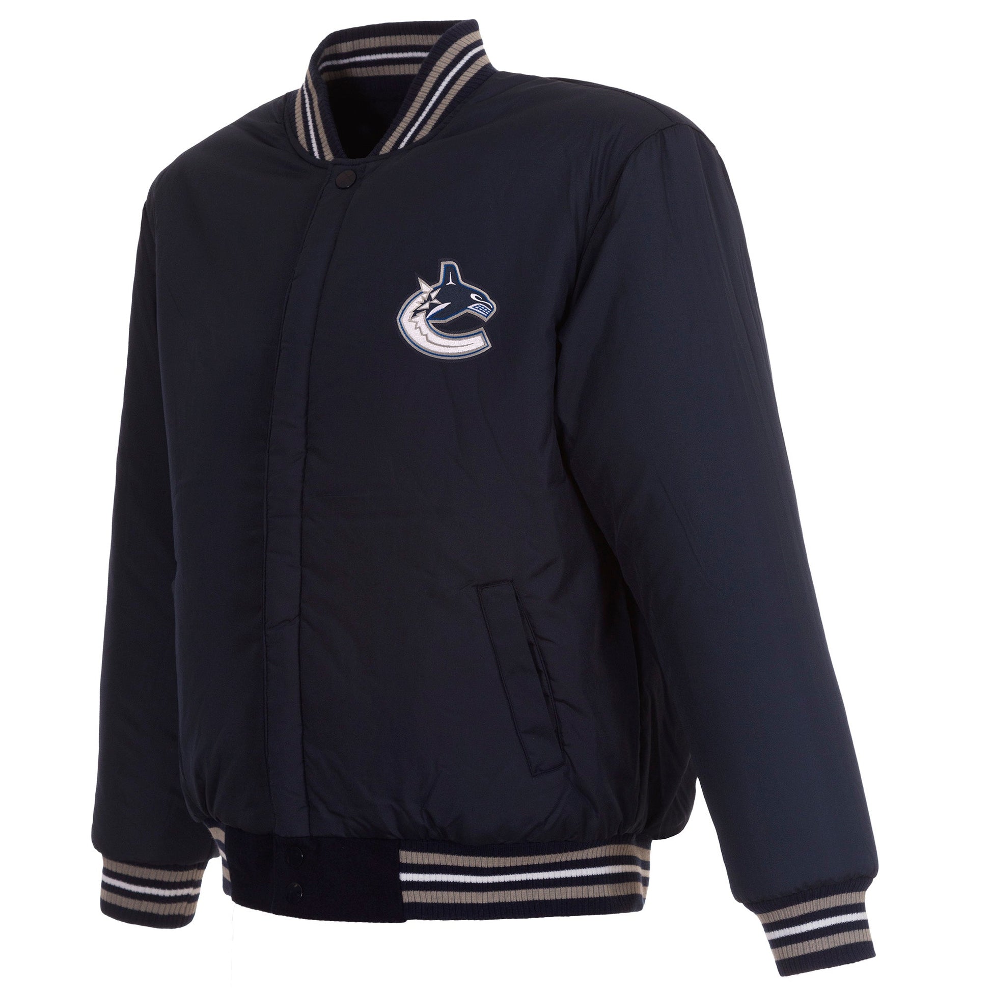 Vancouver Canucks All Wool Jacket with nylon lining in navy and grey with embroidered logos. Assembled in the USA. 55% wool 45% polyester body. Snap button closure.