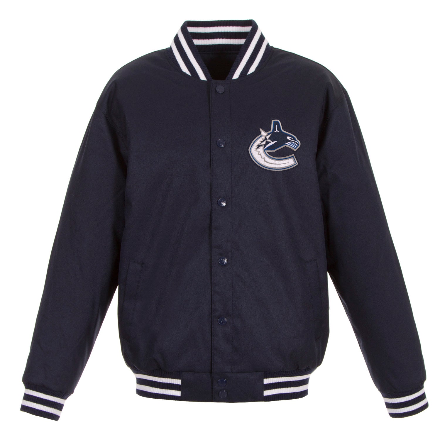 Vancouver Canucks poly-twill jacket in navy with quilted nylon lining and embroidered appliqué logos. (Front Logo Only)