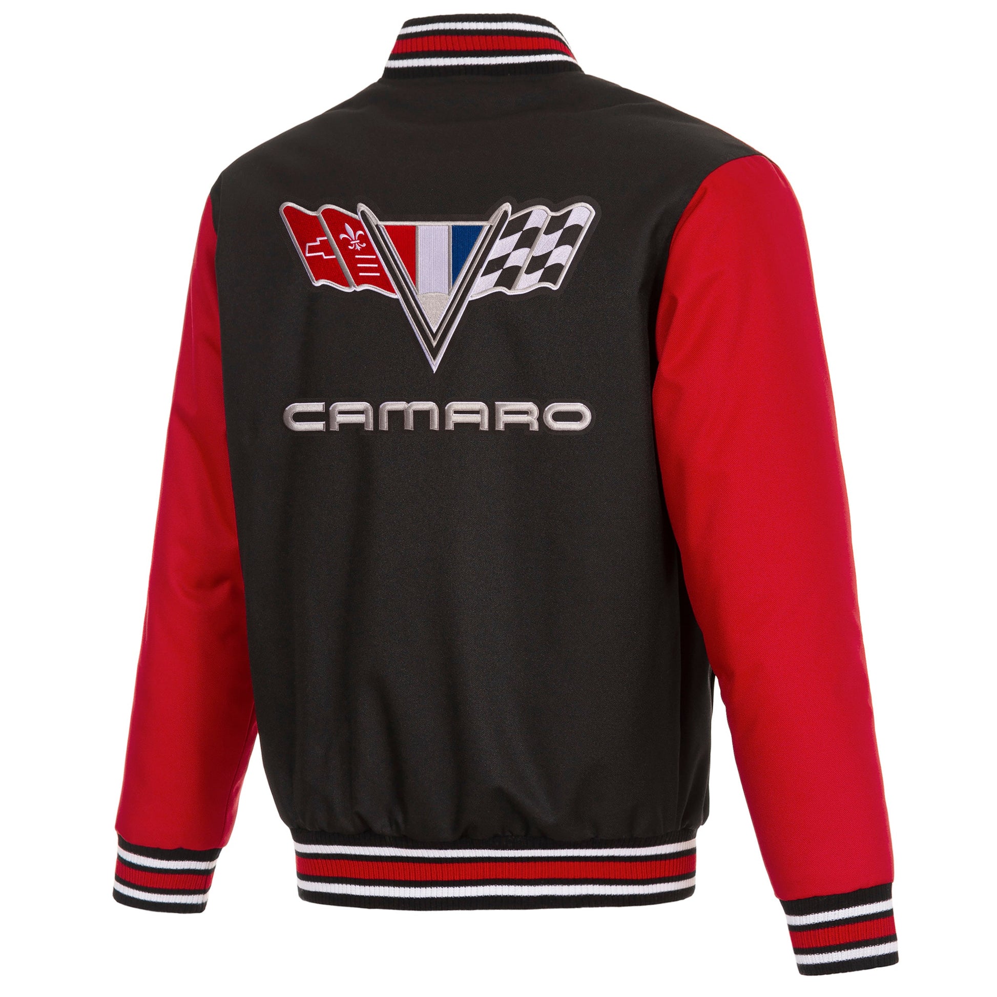 Camaro vintage logo poly-twill jacket in black-red with quilted nylon lining and embroidered appliqué logos. (Front and Back Logo)