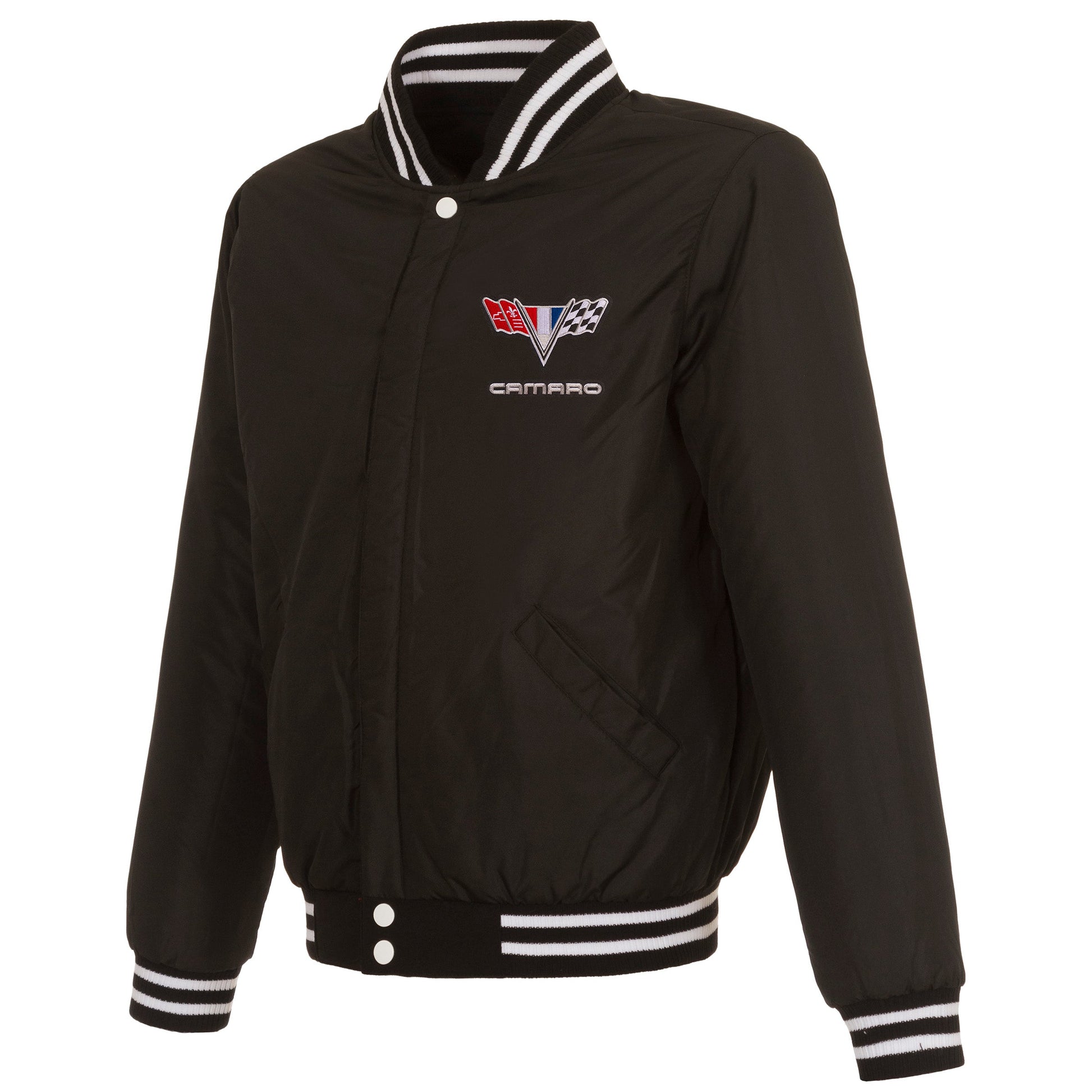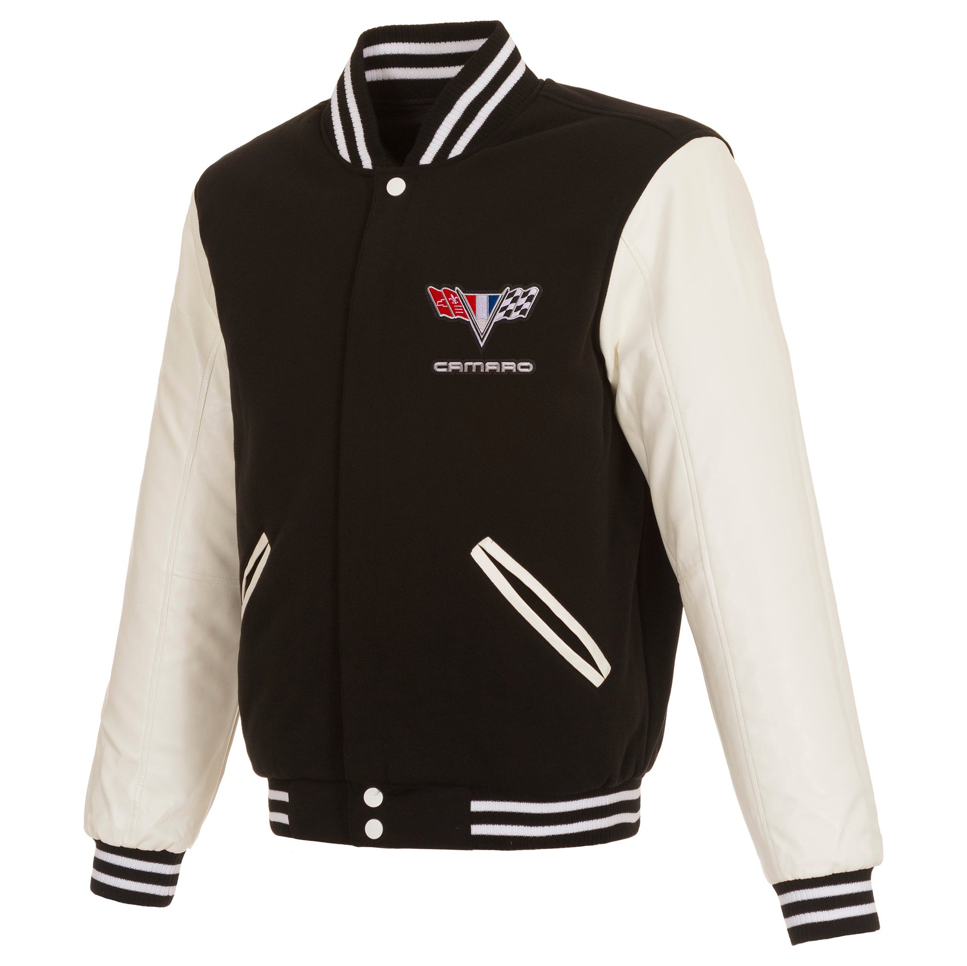 Camaro vintage logo reversible fleece jacket with Faux Leather sleeves in black-white with nylon lining and embroidered logos