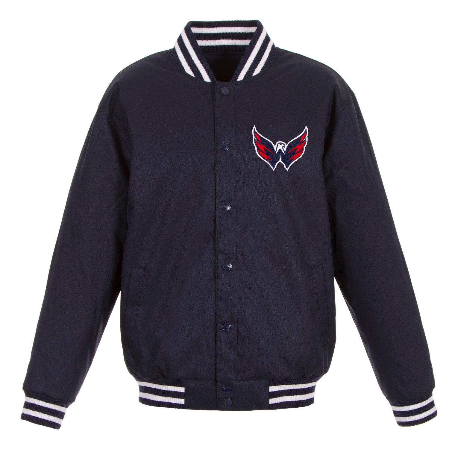 Washington Capitals poly-twill jacket in navy with quilted nylon lining and embroidered appliqué logos. (Front Logo Only)