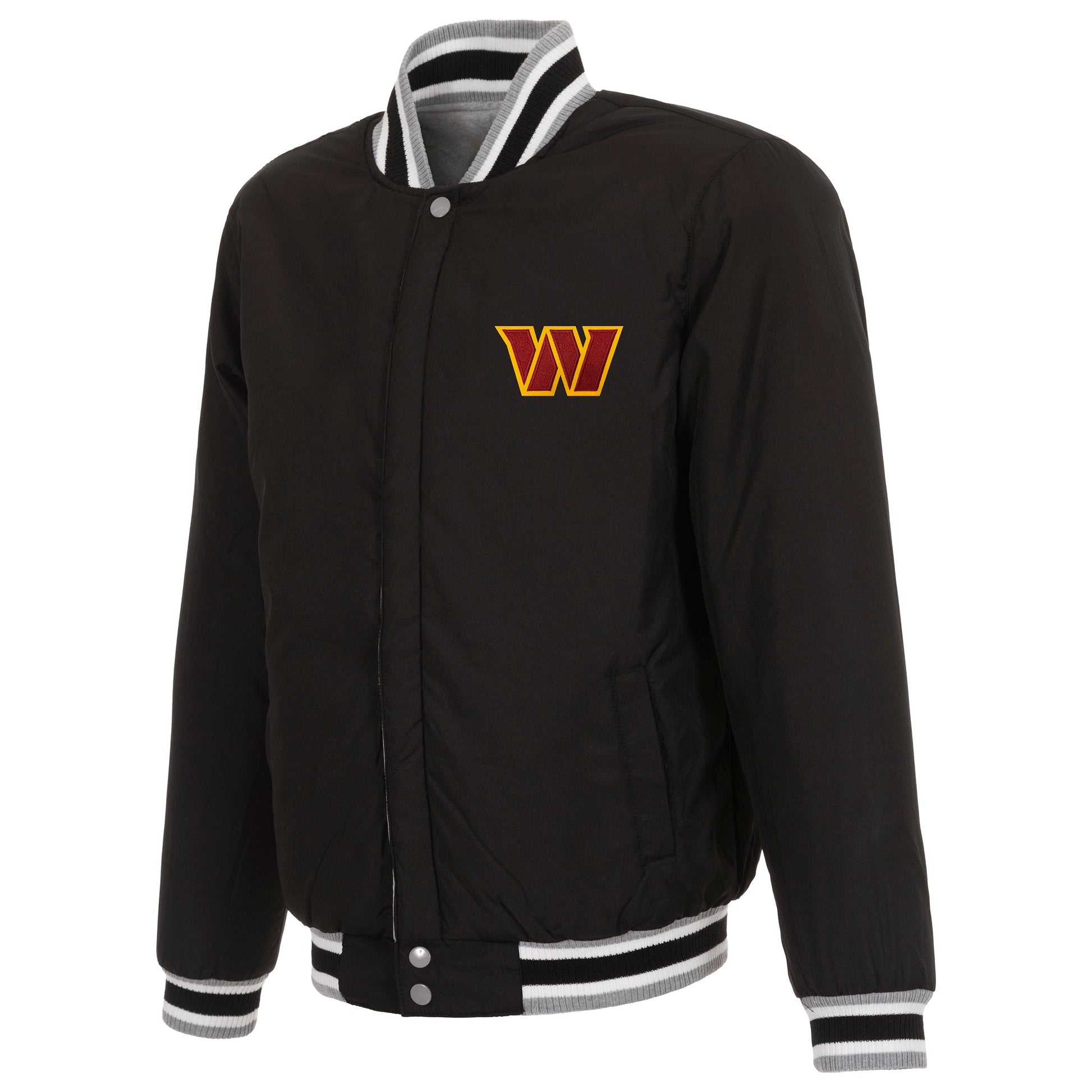 Washington Commanders Reversible Two-Tone Fleece Jacket in grey and navy with embroidered logos. Assembled in the USA. 100% Polyester body, reverse nylon side, snap button closure.