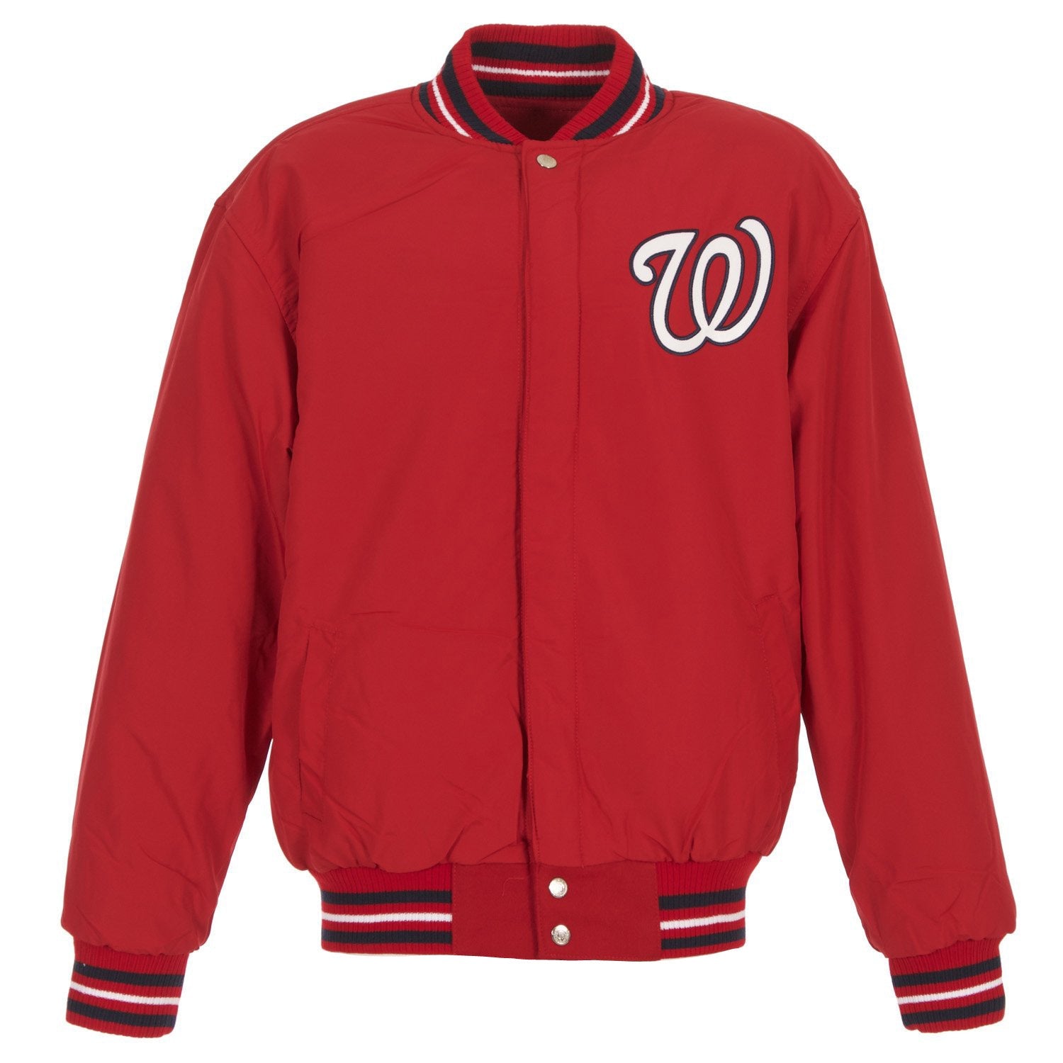 Washington Nationals reversible all wool jacket in red-navy with nylon lining, embroidered appliqué logos and knit trim.