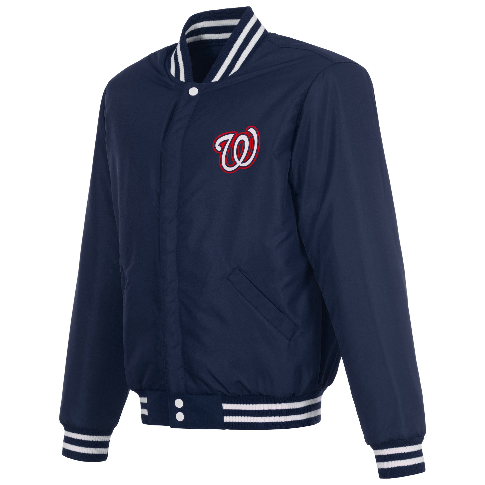 Washington Nationals reversible fleece jacket with Faux Leather sleeves in navy and white with nylon lining and embroidered logos.