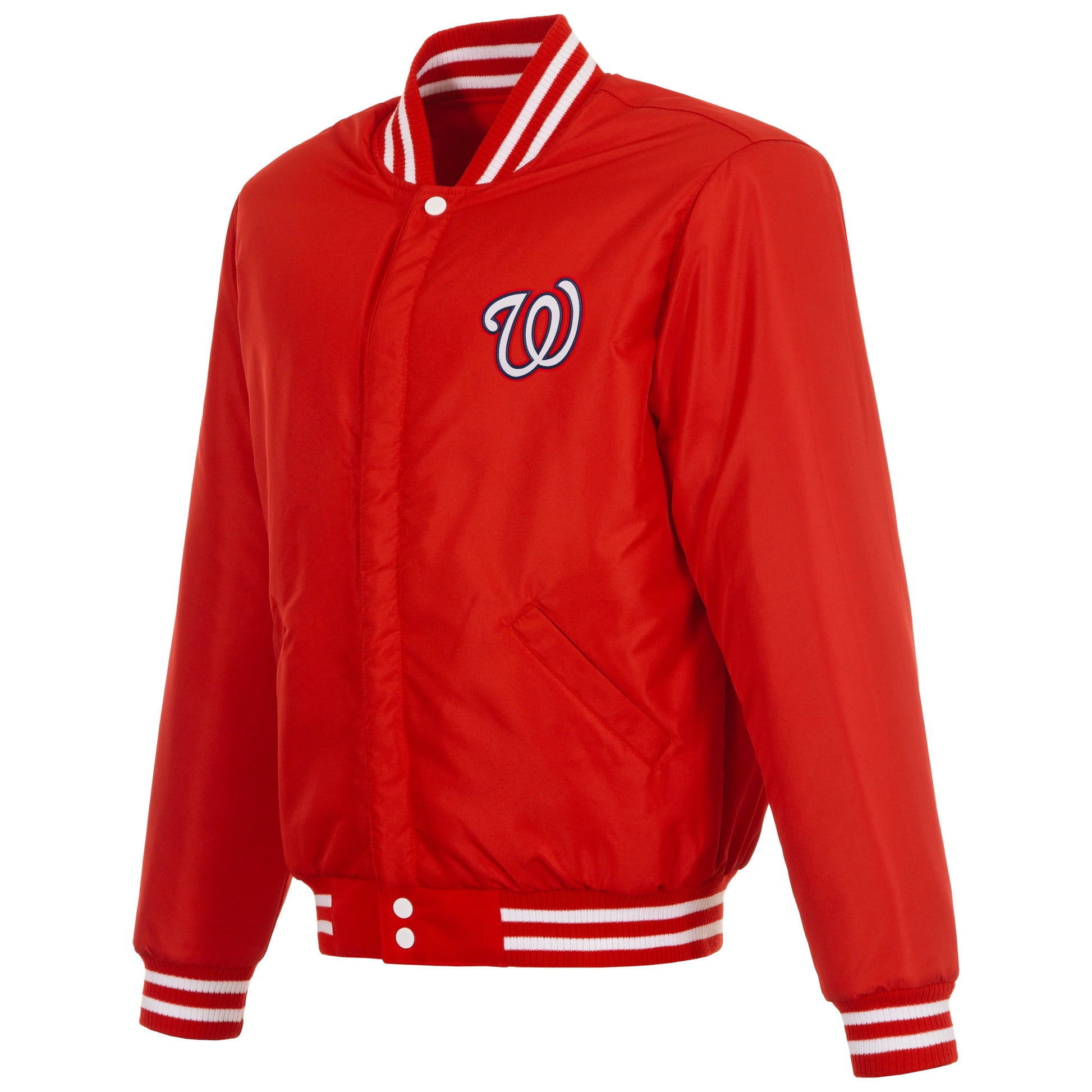 Washington Nationals reversible fleece jacket with faux leather sleeves in red and white with nylon lining and embroidered logos.